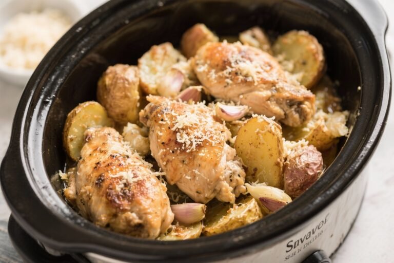 • Slow Cooker Parmesan Garlic Chicken and Potatoes – Comforting, Easy, and Flavor-Packed