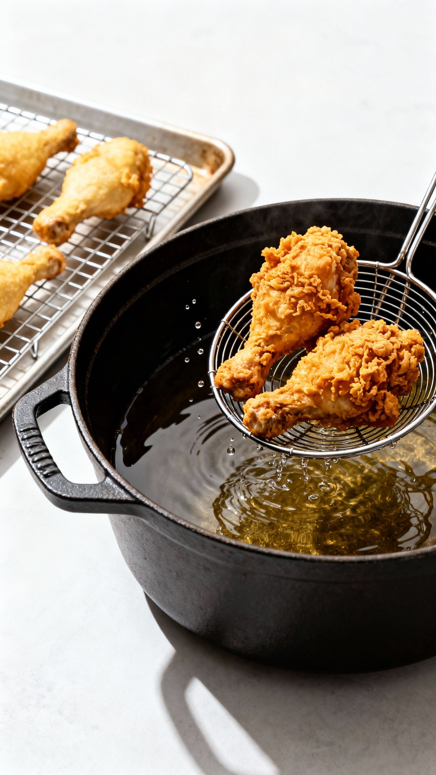 2. Fry the drumsticks again, 2–3 minutes per batch, until deep golden brown and 165–175°F internally. The crust will tighten and crisp dramatically.