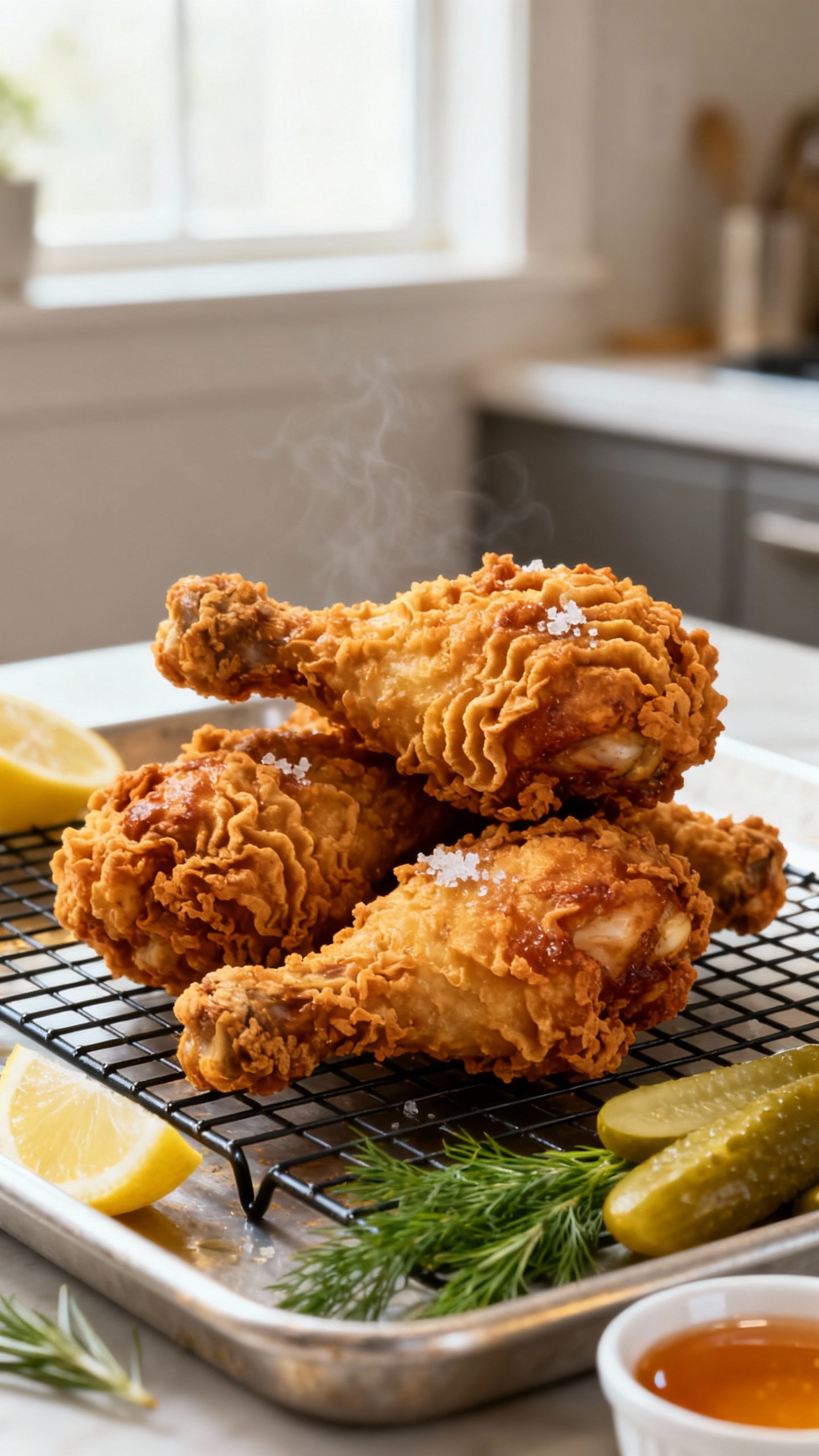 • Fry the drumsticks again, 2–3 minutes per batch, until deep golden brown and 165–175°F internally. The crust will tighten and crisp dramatically.
