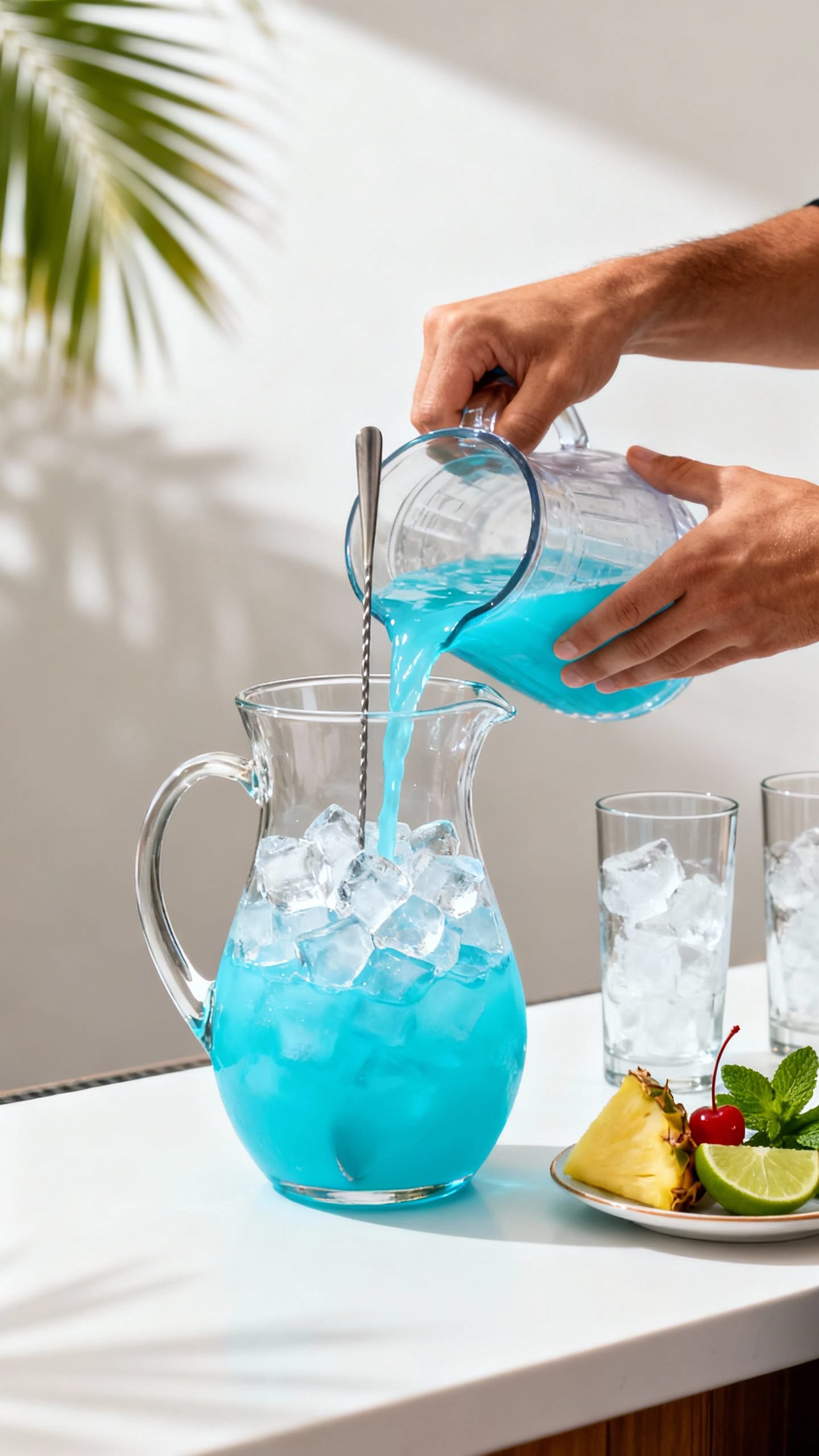 - Mix the base: In a large pitcher, combine white rum, coconut rum, blue curaçao, pineapple juice, coconut water, and lime juice. Stir until fully blended.