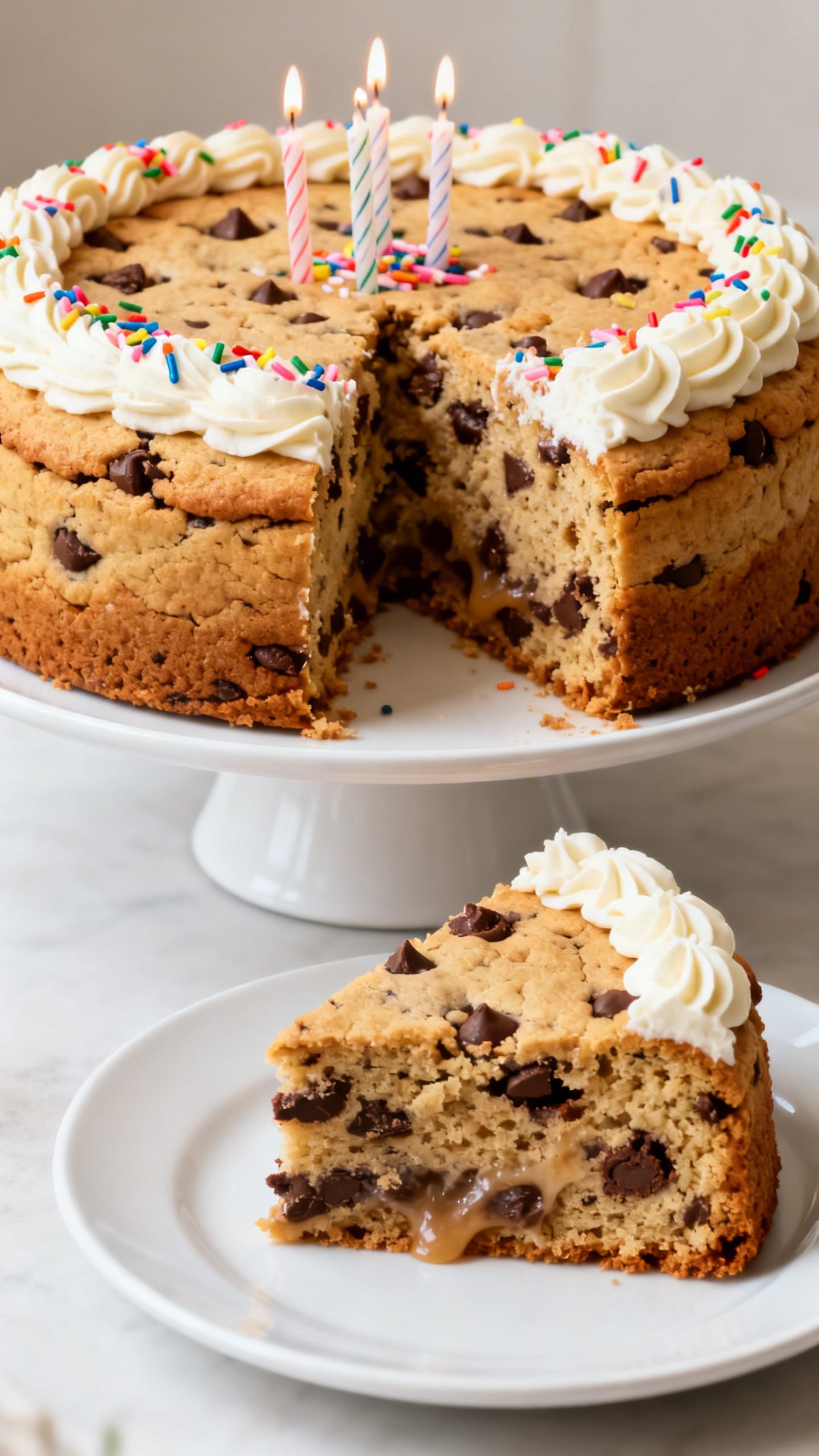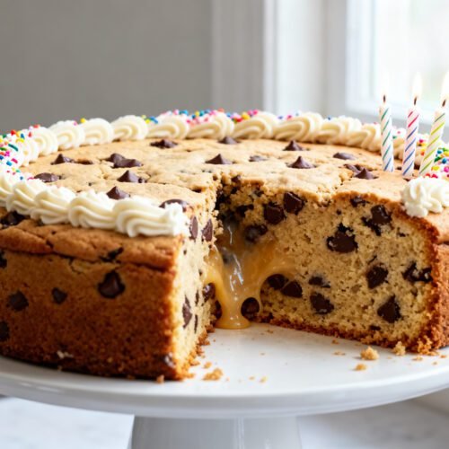 Nothing beats a big, bakery-style chocolate chip cookie cake when you want an easy, crowd-pleasing birthday dessert. It bakes in one pan, slices like a cake, and tastes like the chewiest, softest cookie ever—perfect for frosting swirls, sprinkles, and candles.