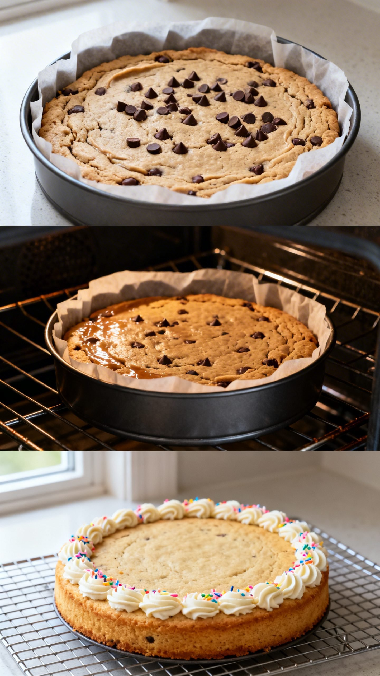 • Pipe a border around the cooled cookie cake, add sprinkles and more chocolate chips if desired, slice, and serve.