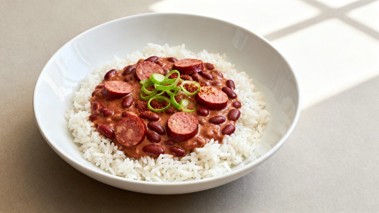 Classic Southern red beans slow-cooked to a silky, creamy texture with smoked sausage and Cajun spices, served over white rice.