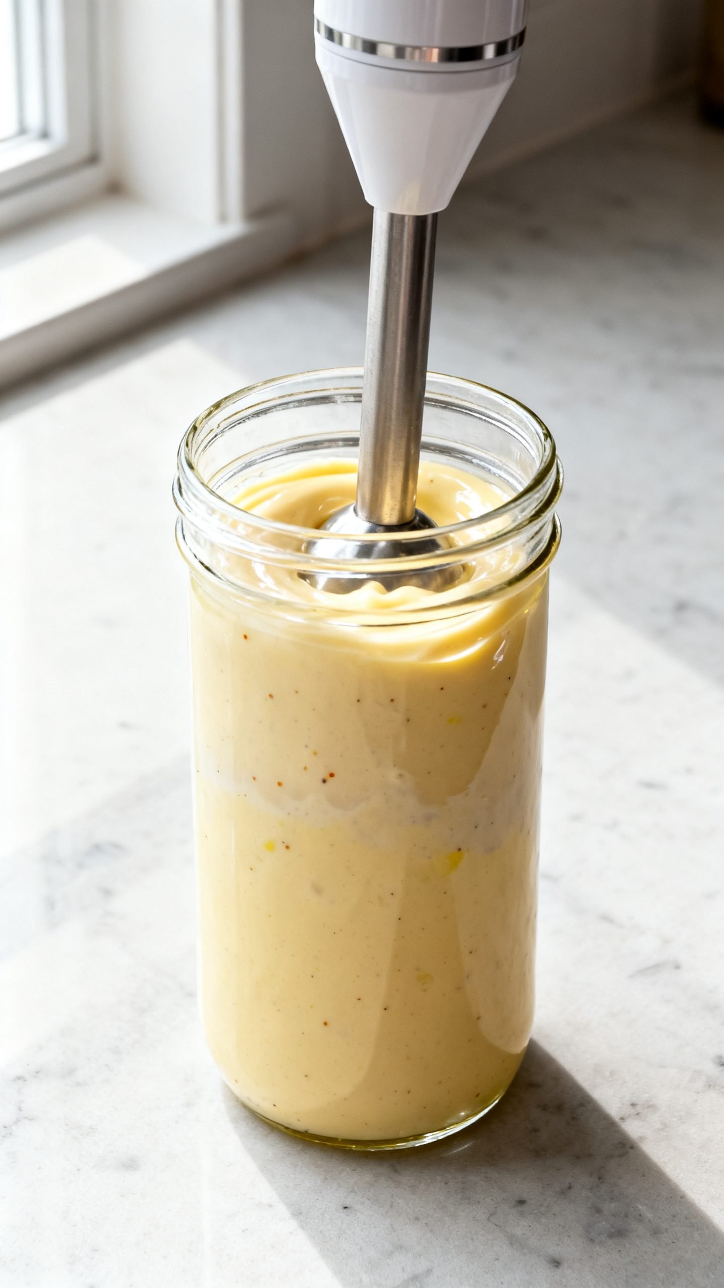 4. Lift slowly: Gently raise the blender as the emulsion forms, pulsing to incorporate the remaining oil. Stop when thick and glossy.
