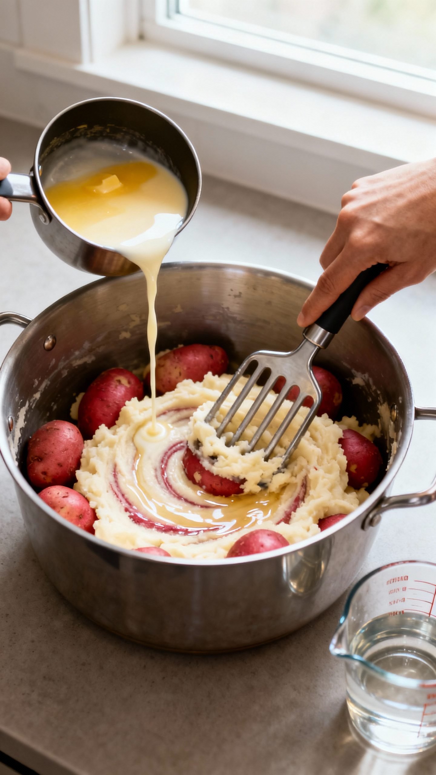 - Warm the dairy: In a small saucepan over low heat, melt butter with the cream. Keep it warm—warm dairy blends better and prevents gummy potatoes.