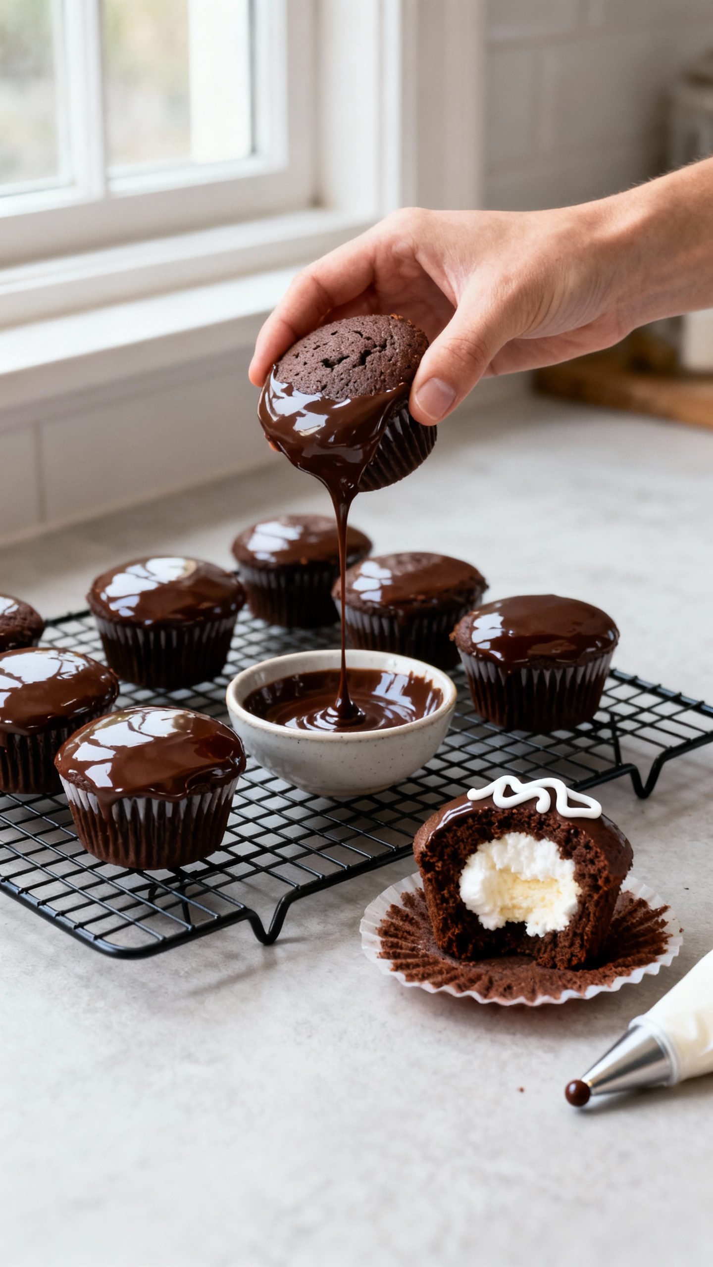 - Dip each filled cupcake top-first into the ganache, letting excess drip off. Set on a rack to set 15–20 minutes.