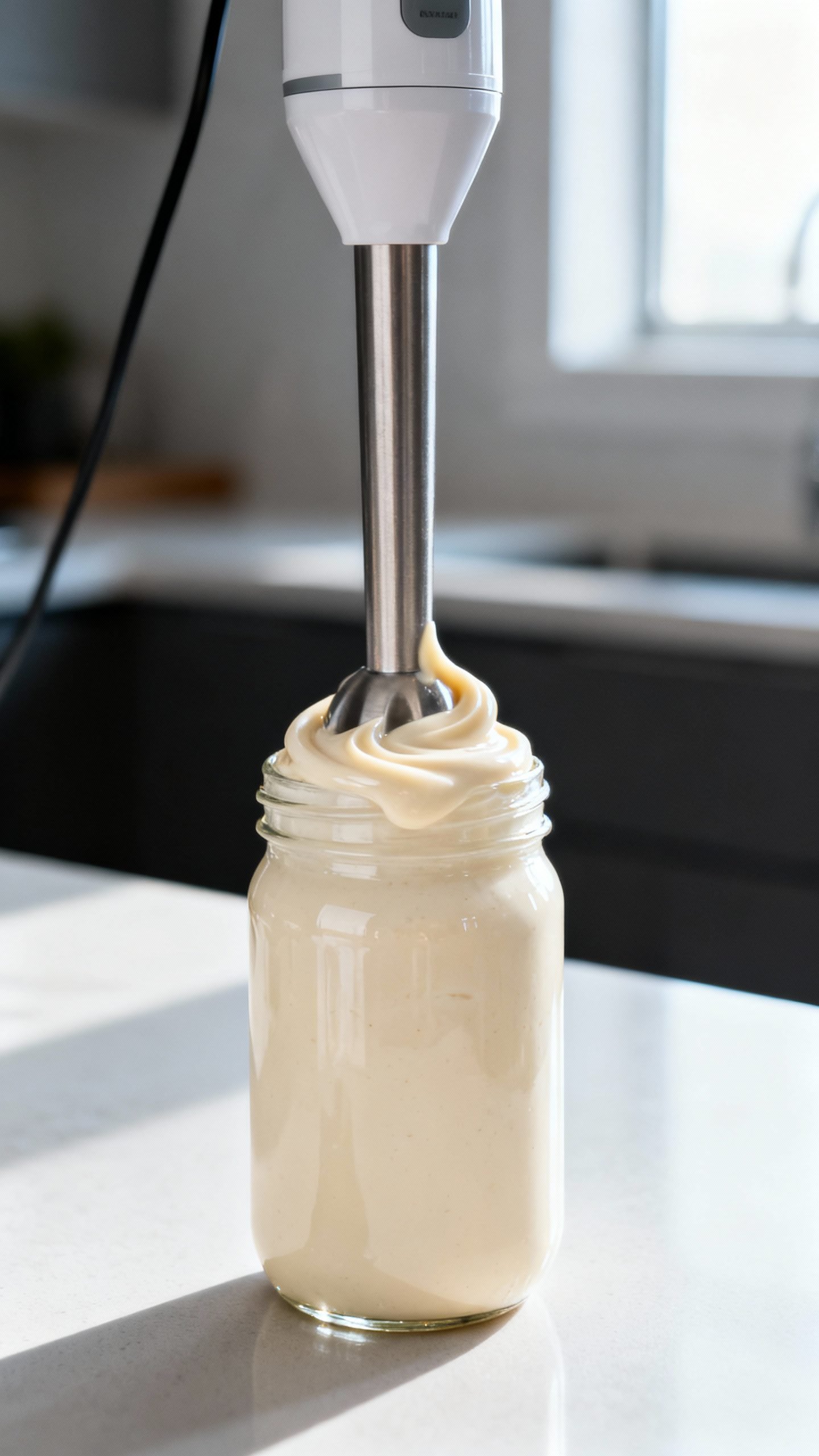 - Blend from the bottom: Place the immersion blender at the bottom of the jar. Turn it on and hold it steady for 10–15 seconds. You’ll see a thick, pale emulsion form at the base.