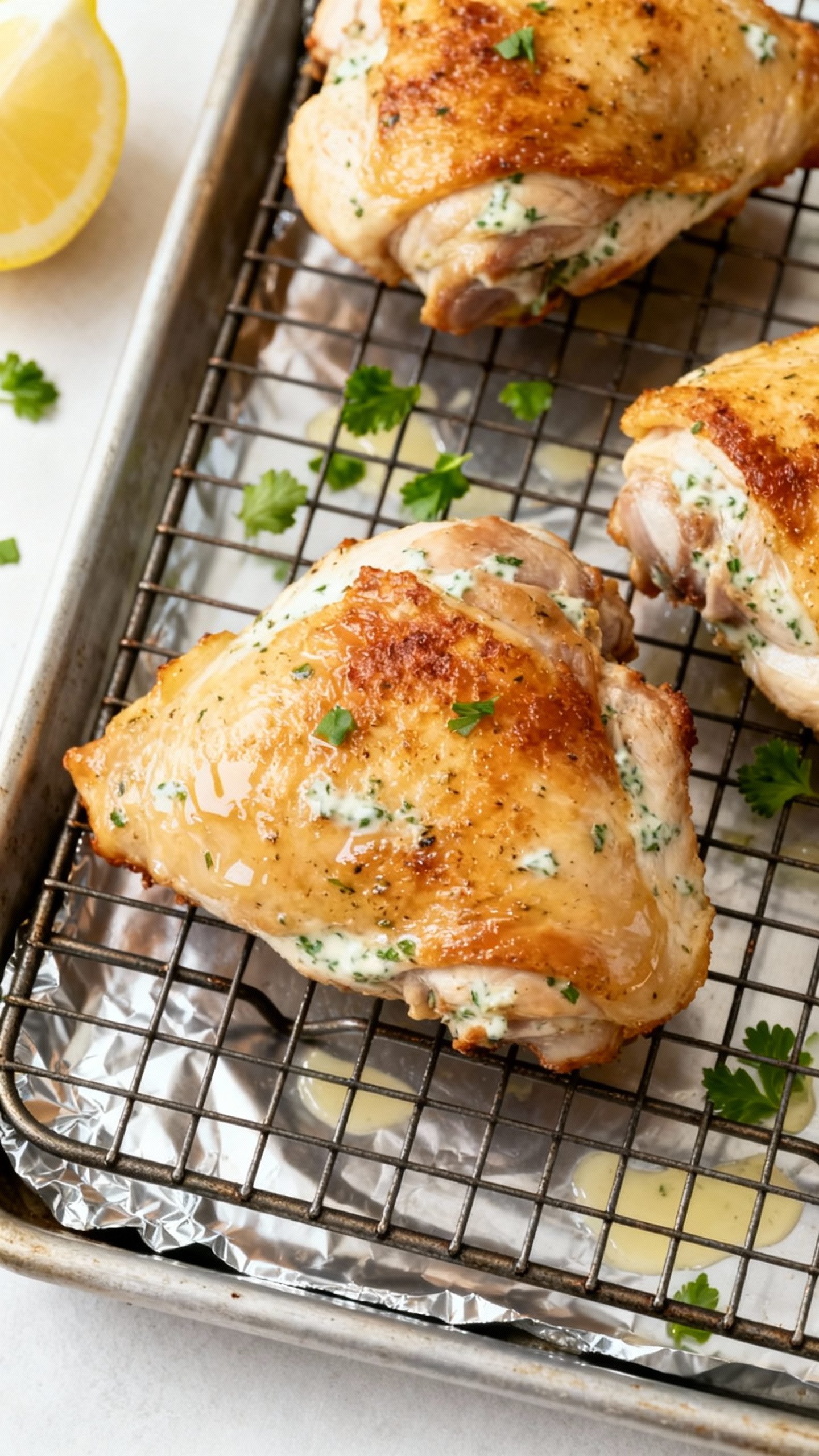 6. Bake until crisp and juicy: Roast for 30–38 minutes, depending on size, until the skin turns deep golden and an instant-read thermometer in the thickest part reads 175–190°F for ultra-tender thighs.