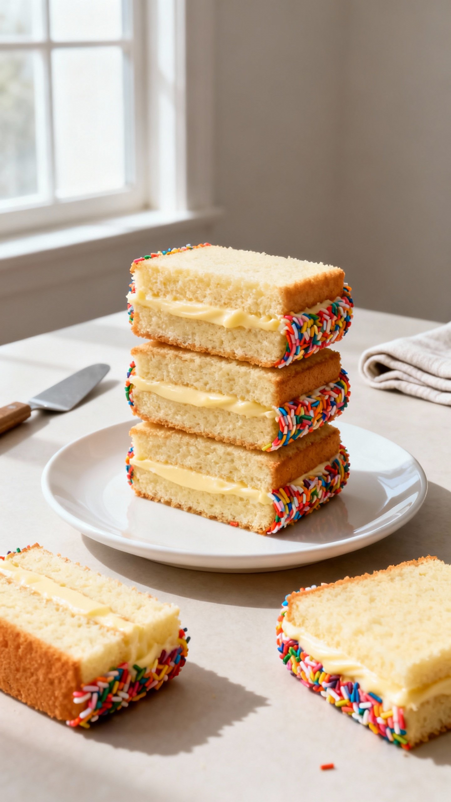 I love this recipe because it uses pantry staples, bakes in one pan, and turns out soft, moist, and sliceable. You can mix and match flavors, roll the edges in sprinkles, or swirl different fillings. If you can bake a simple cake, you can make cake sandwiches. Let’s do it.