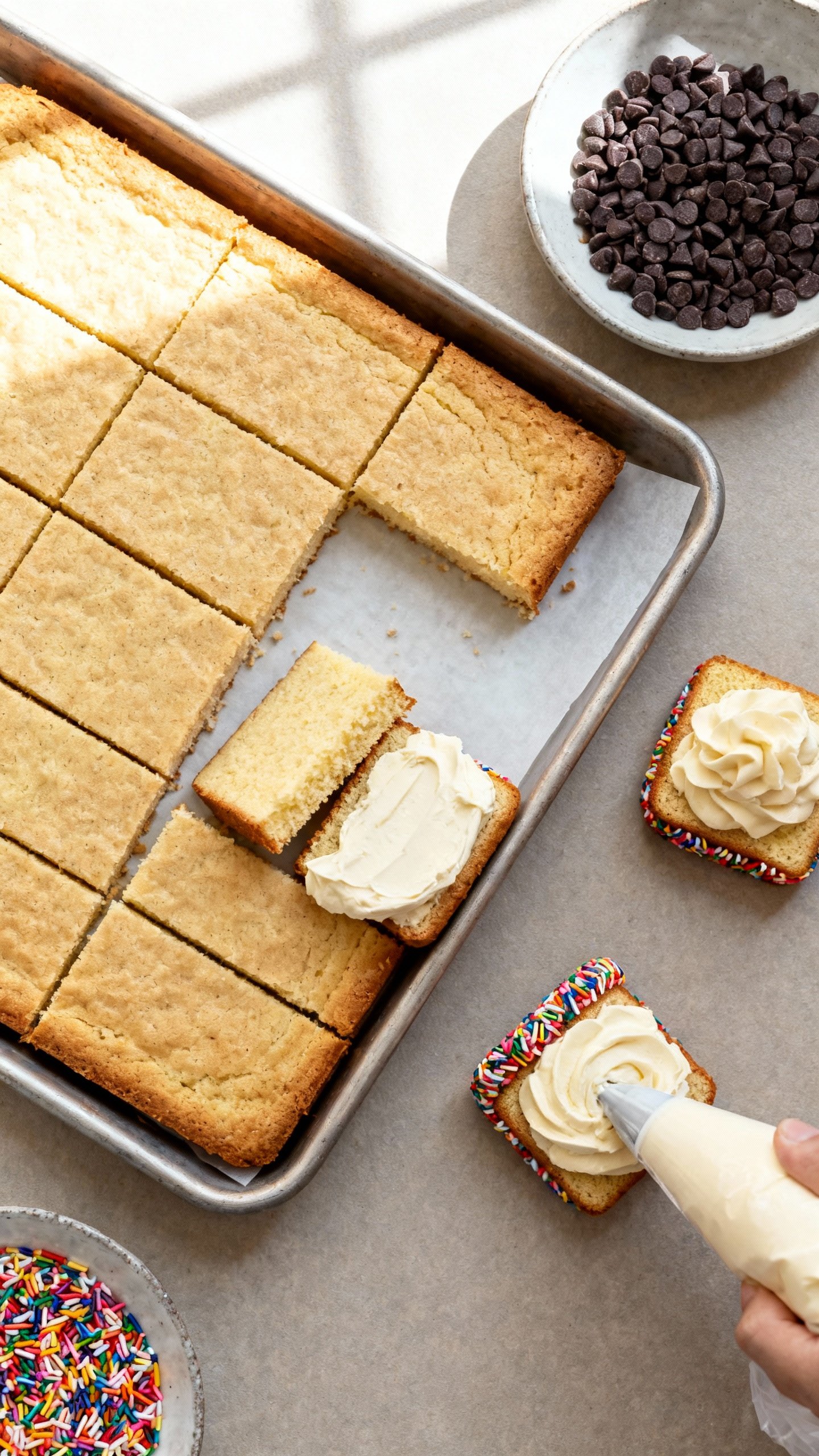 - One-pan bake: You bake a single sheet cake and slice it into rectangles. No stacking and leveling full layers.