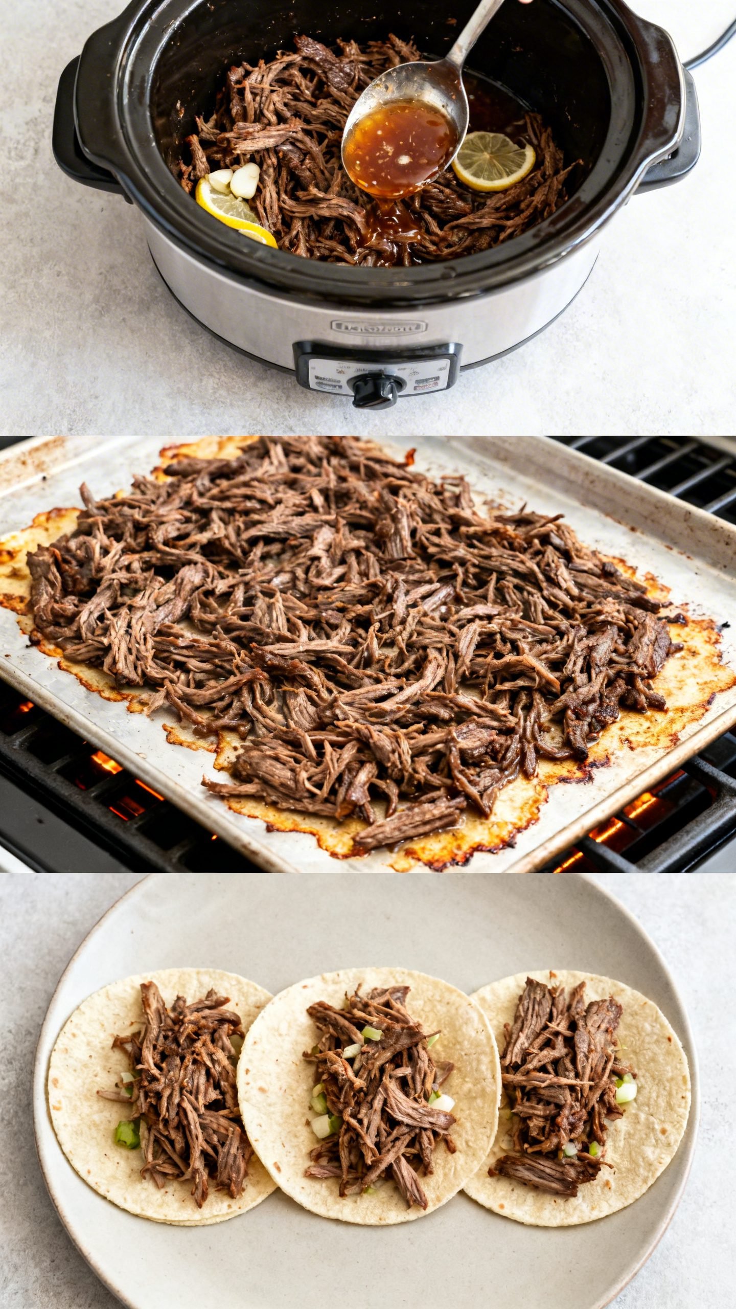 - For taco-truck edges, spread beef on a sheet pan and broil for 3–5 minutes until caramelized and crispy in spots. Spoon a little more liquid over to gloss.