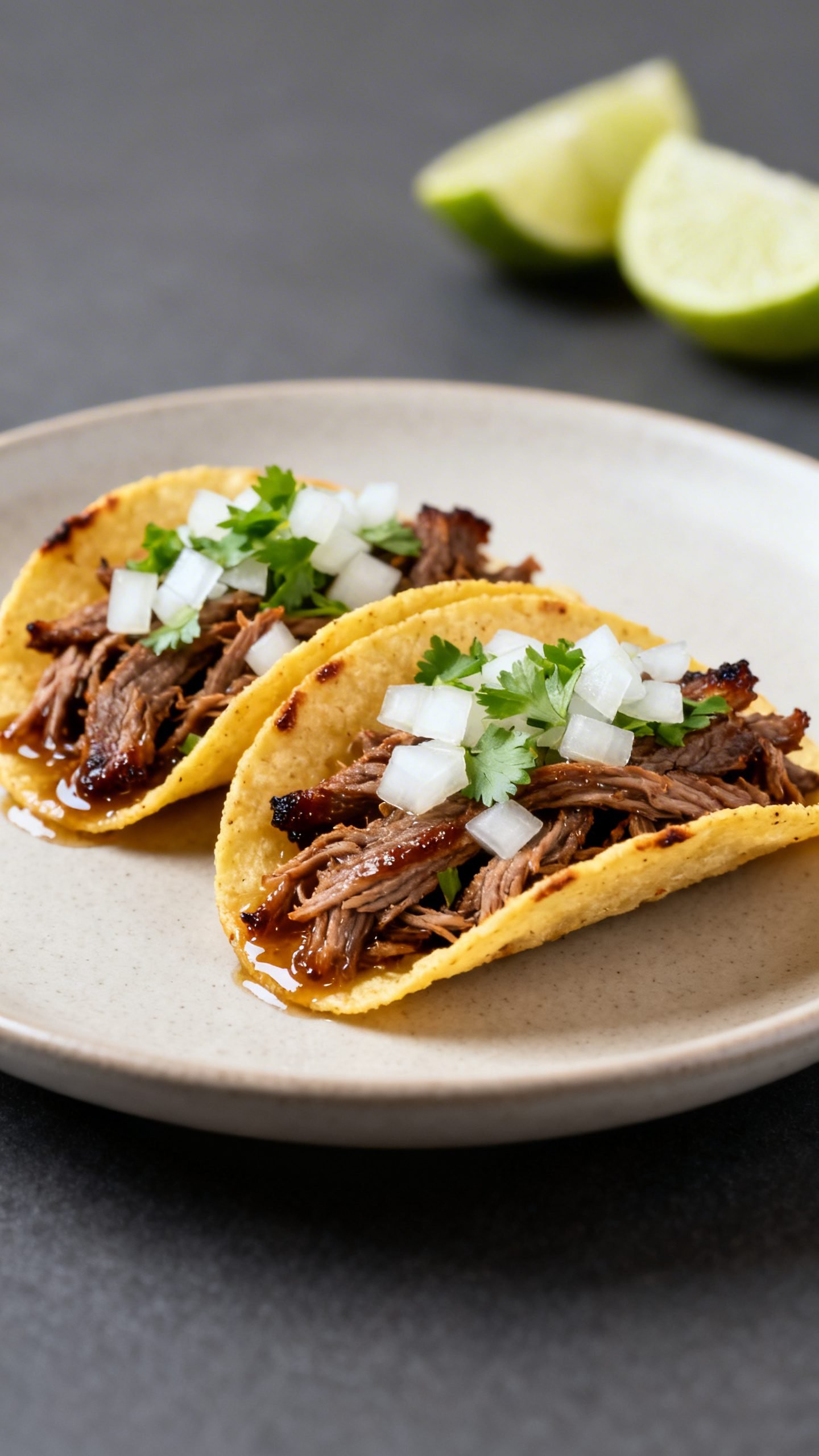 - Fill tortillas with the beef and top with diced onion, cilantro, a squeeze of lime, salsa, and any additional desired toppings.