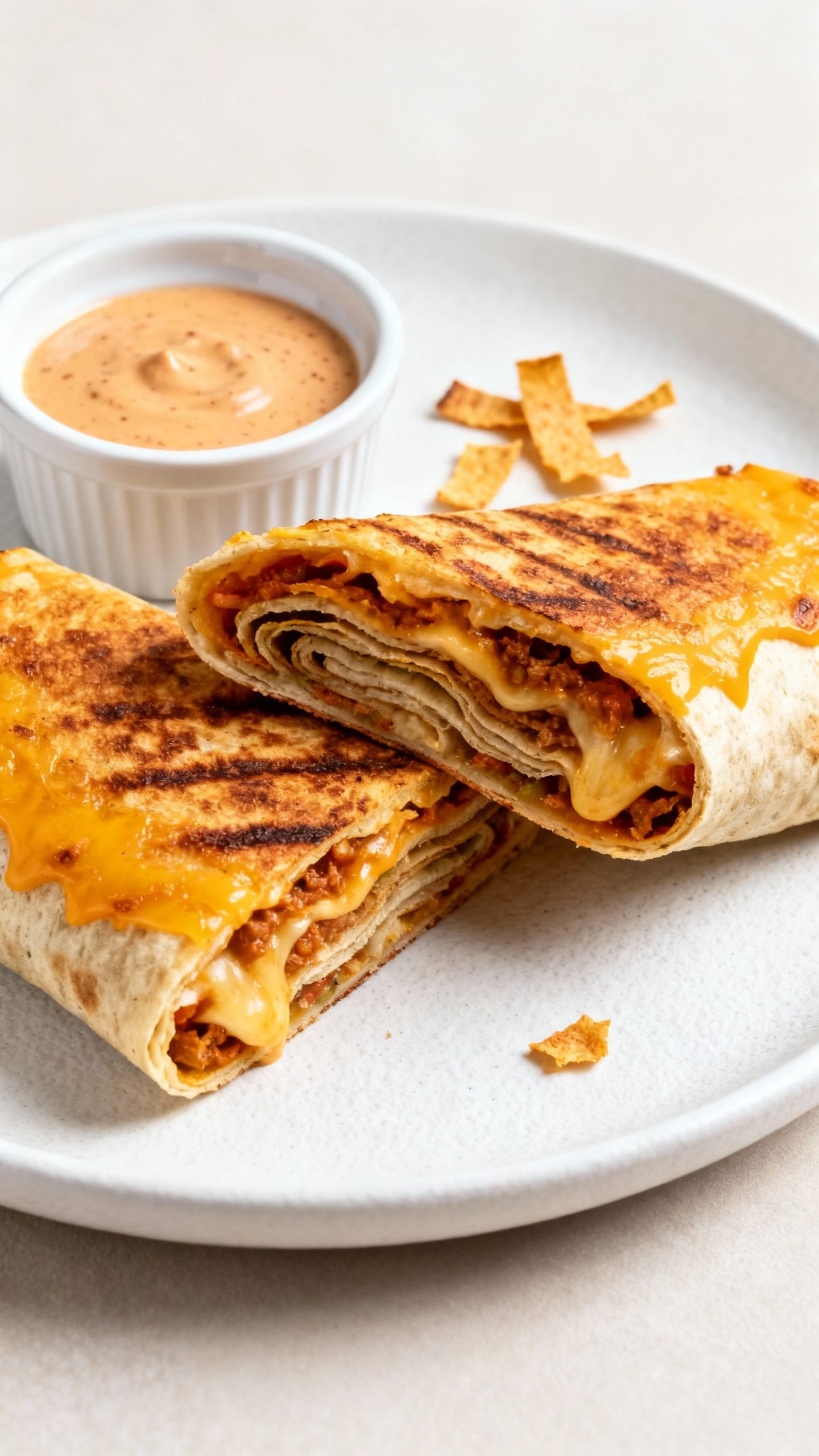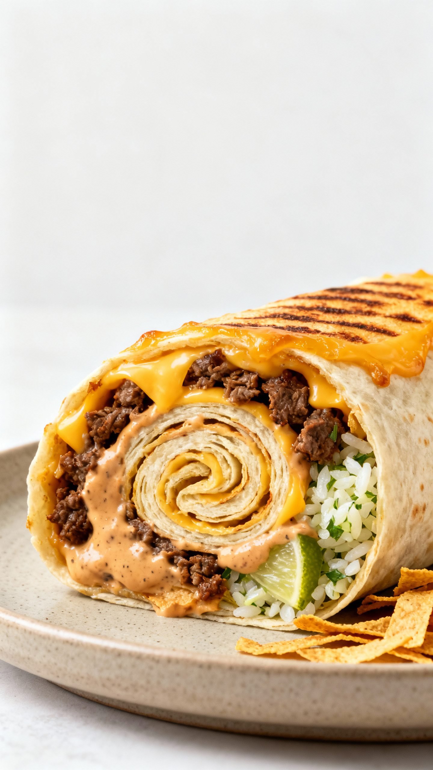 A fast, cheesy copycat Taco Bell grilled cheese burrito with seasoned beef, lime rice, creamy chipotle sauce, and a crispy cheese-crusted tortilla. Easy to customize with different proteins and heat levels.