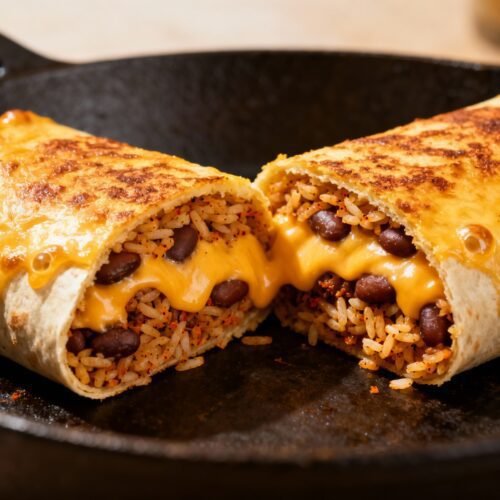 For best results, avoid overfilling, warm tortillas before rolling, and use medium heat for an even cheese crust. Refrigerate cooled burritos up to 3 days; freeze without the cheese crust up to 2 months and add the crust after reheating. Reheat in a skillet or air fryer until hot and crisp. Customize with chicken, beans, or veggies, and adjust chipotle for heat.