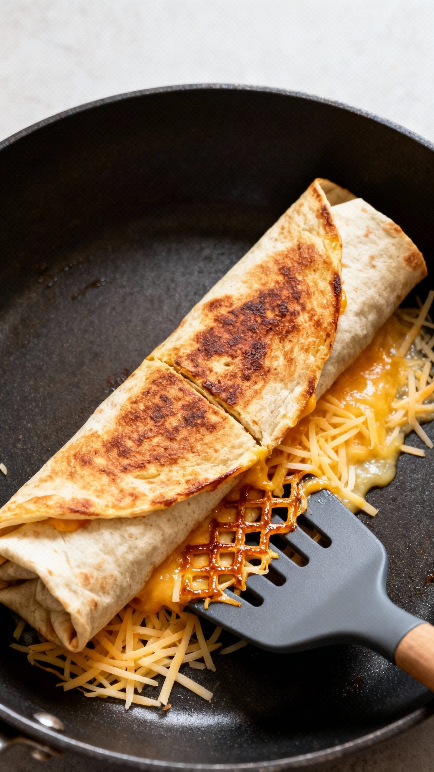 • Place the burrito seam-side down onto the cheese. Cook 2–3 minutes until the cheese melts and browns into a crispy crust.