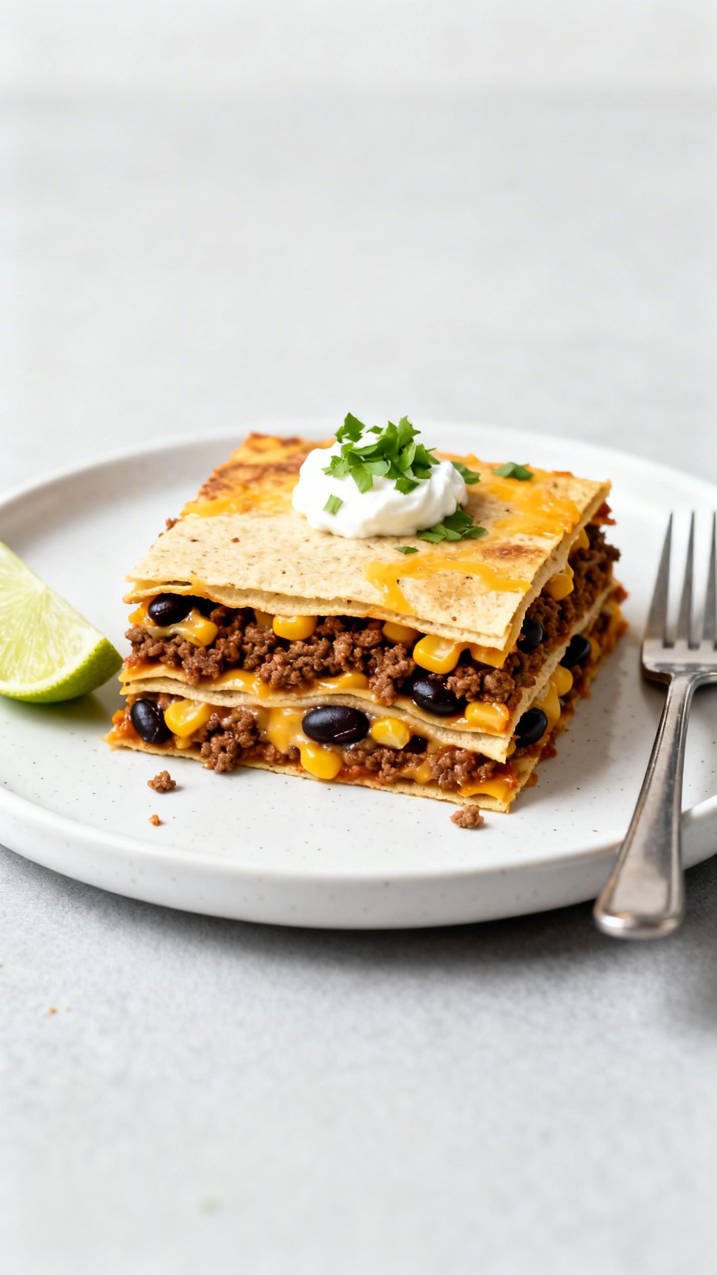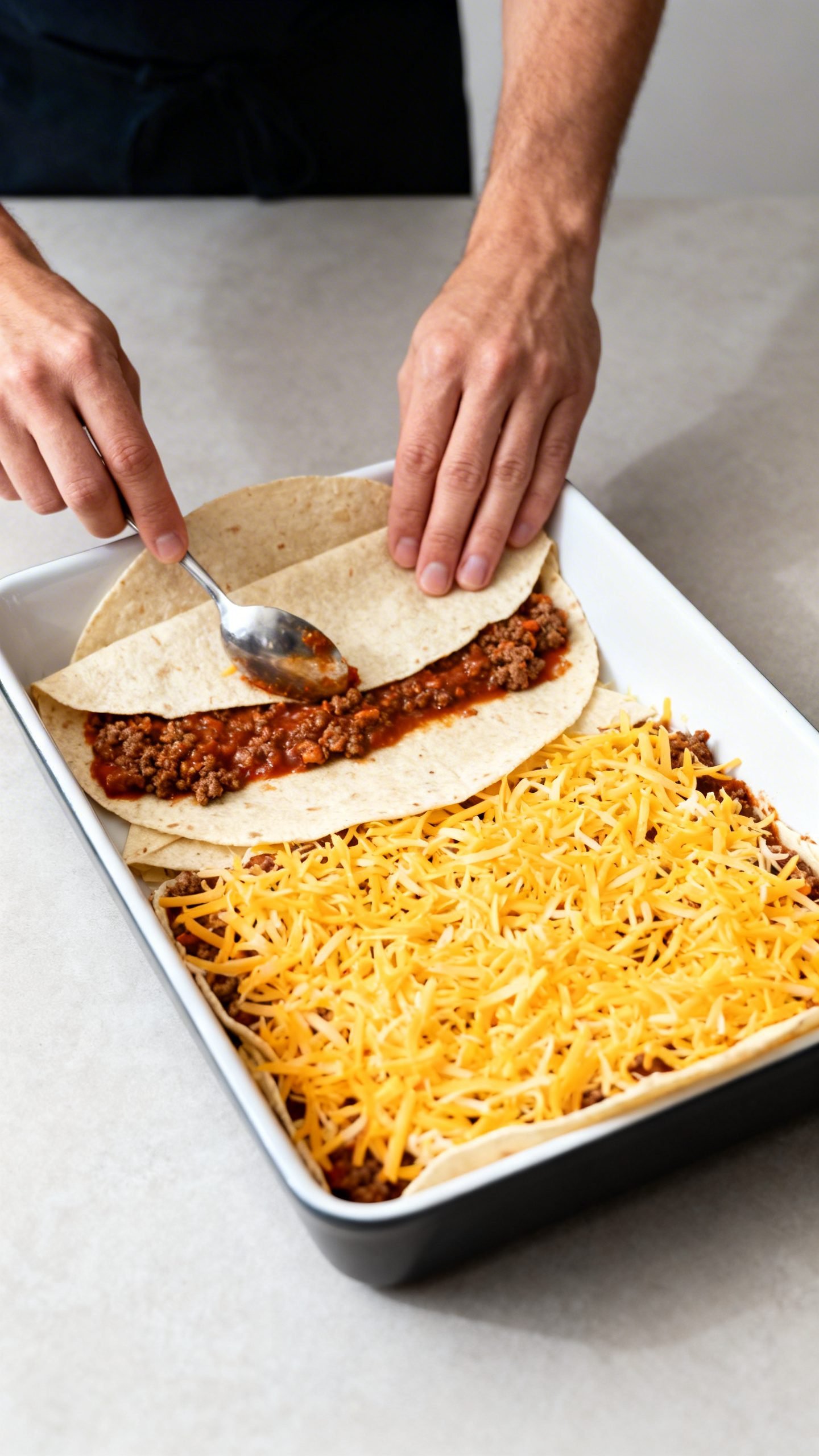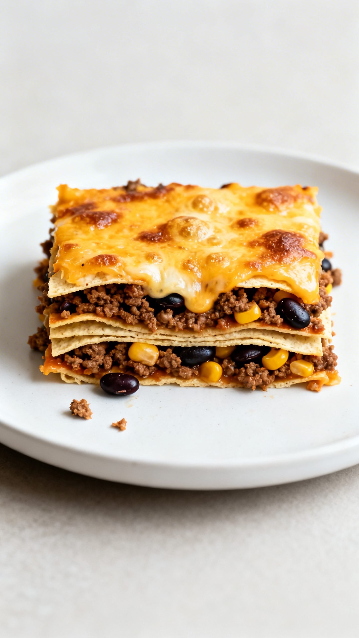 Use a thick, spoonable filling to prevent soggy tortillas and drain excess fat from the beef. Corn tortillas give a classic flavor while flour tortillas create a softer, lasagna-like texture. Lightly toast tortillas if you want extra structure. Assemble up to 24 hours ahead and refrigerate; bake covered 25 minutes, then uncover 10–12 minutes. Cool leftovers before storing; refrigerate 3–4 days or freeze up to 2 months. Reheat slices in the microwave 2–3 minutes or bake covered at 350°F until hot.