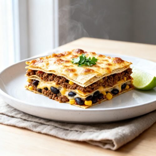 This easy taco lasagna layers tortillas, seasoned ground beef, salsa, beans, corn, and cheese into a bubbly, crowd-pleasing casserole. It’s flexible, meal-prep friendly, and perfect for weeknights or potlucks.