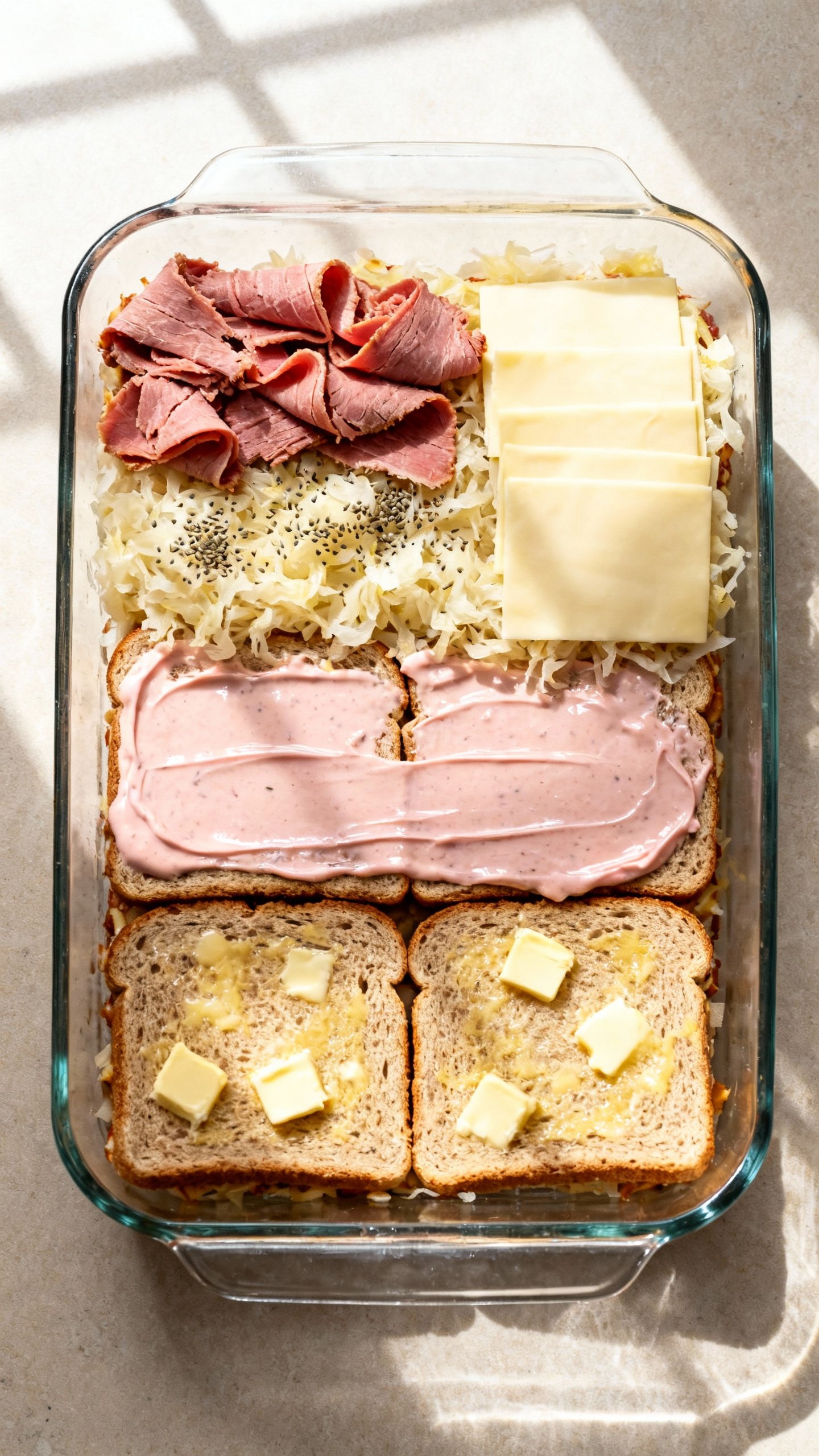 • Repeat layers: bread + dressing, remaining beef, remaining sauerkraut, caraway, then the rest of the Swiss.