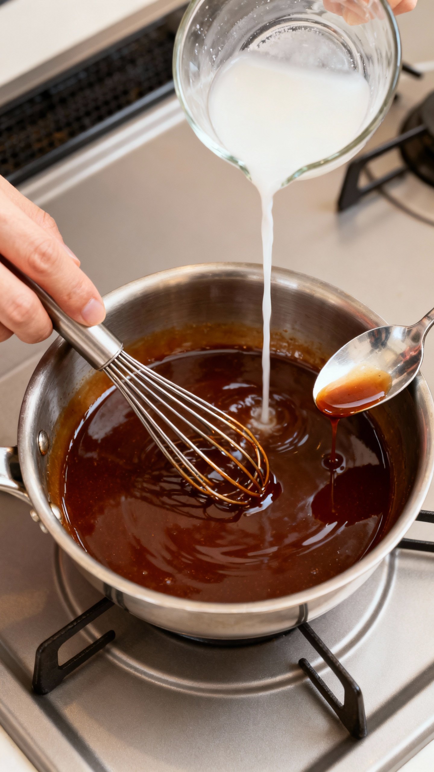 • Whisk the slurry into the simmering sauce. Cook 30–60 seconds until it lightly coats a spoon.
