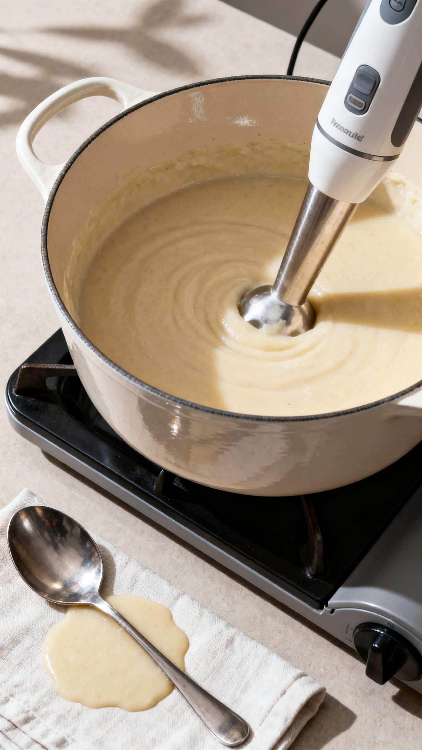 - Blend smooth: Remove the bay leaf. Use an immersion blender to puree until silky. Or carefully blend in batches in a countertop blender, venting the lid and covering with a towel.