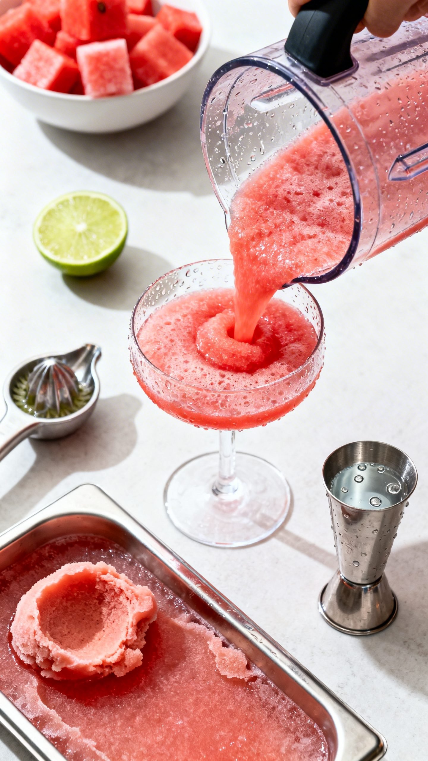 - Add to a high-speed blender: 4 cups frozen watermelon, 2 cups frozen strawberries, 1.5 cups very cold or semi-frozen rosé, 1/4 to 1/2 cup vodka, and 2–3 tablespoons fresh lime juice.