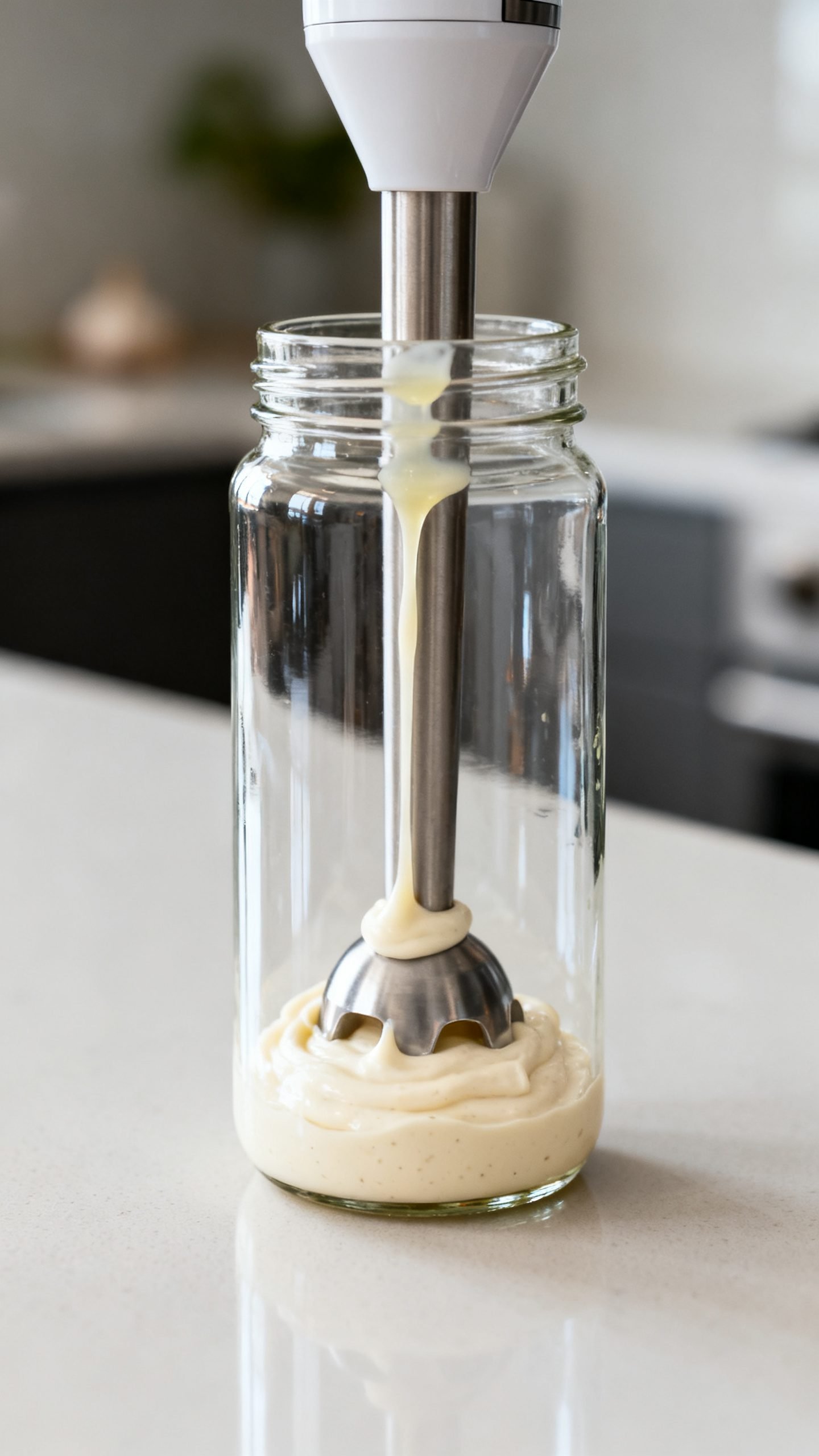 • Place an immersion blender at the bottom of the jar, turn it on, and blend without moving for 10–15 seconds until the base thickens and turns pale.