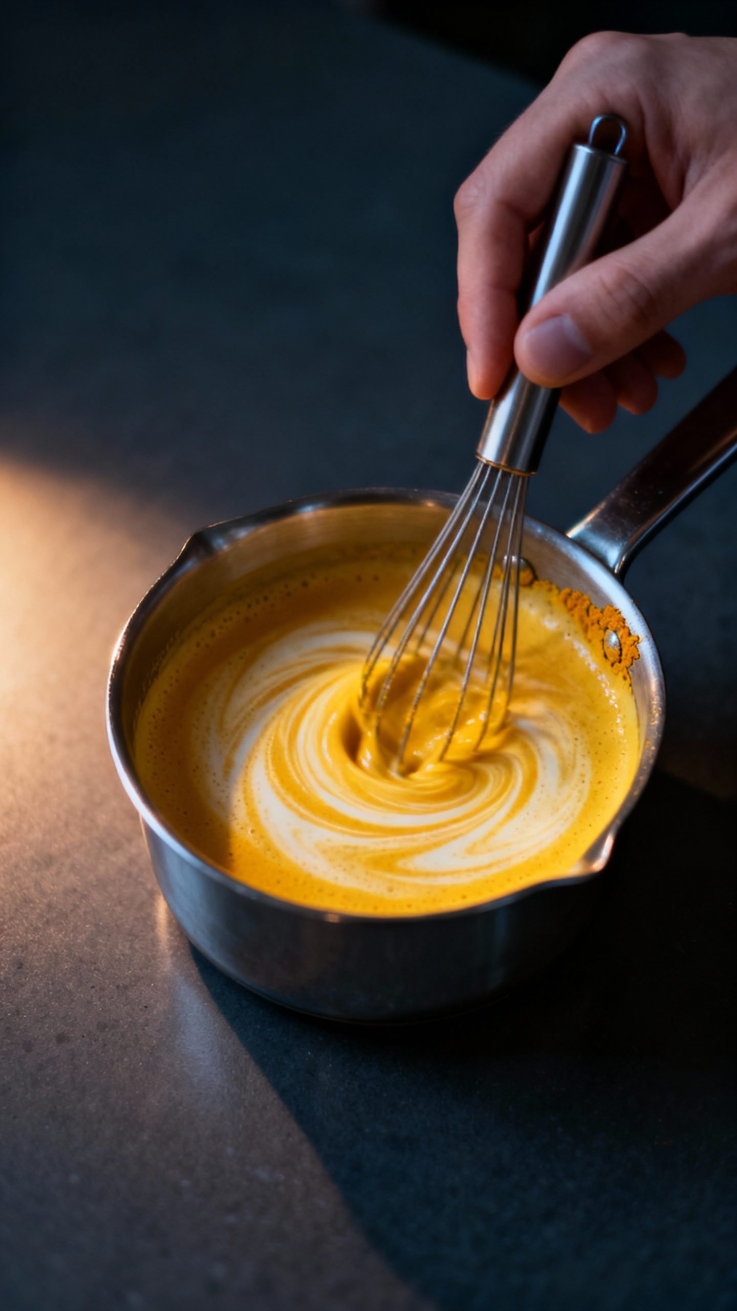 2. Whisk in the spices: Add turmeric, cinnamon, ginger, black pepper, and coconut oil or ghee if using. Whisk until no clumps remain and the color turns bright gold.