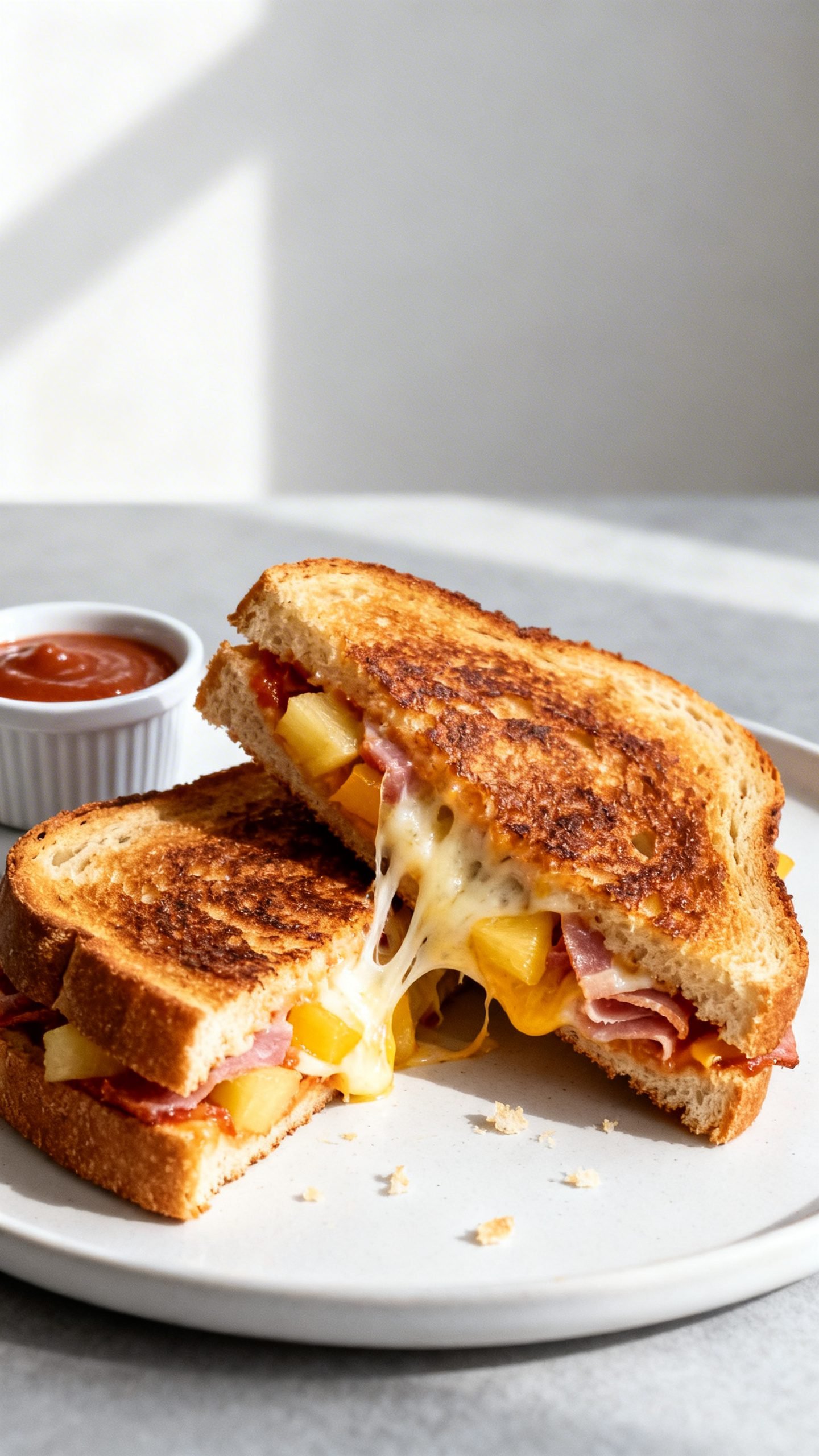 This Hawaiian Pizza Grilled Cheese hits every craving: salty ham, sweet pineapple, melty mozzarella, and tangy pizza sauce hugged by buttery, golden bread. It’s a quick, crave-worthy sandwich you can throw together any night of the week—no oven, no fuss, just big flavor.