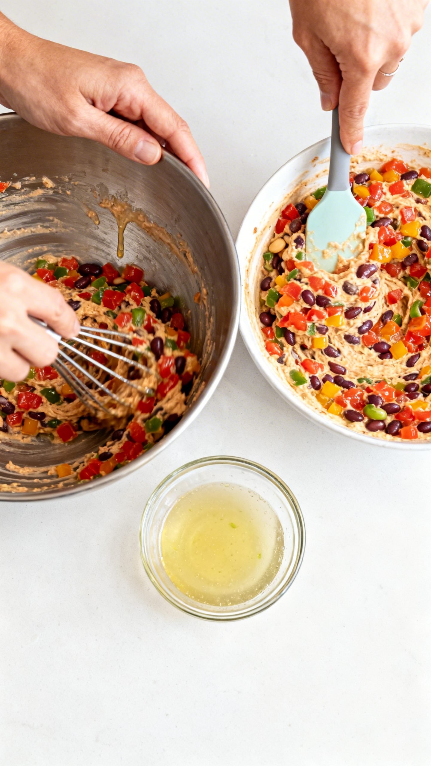 - Prep the produce: Dice bell peppers and red onion, mince jalapeño, and chop cilantro. Quarter the cherry tomatoes. Rinse and drain the beans well to avoid watery dip.