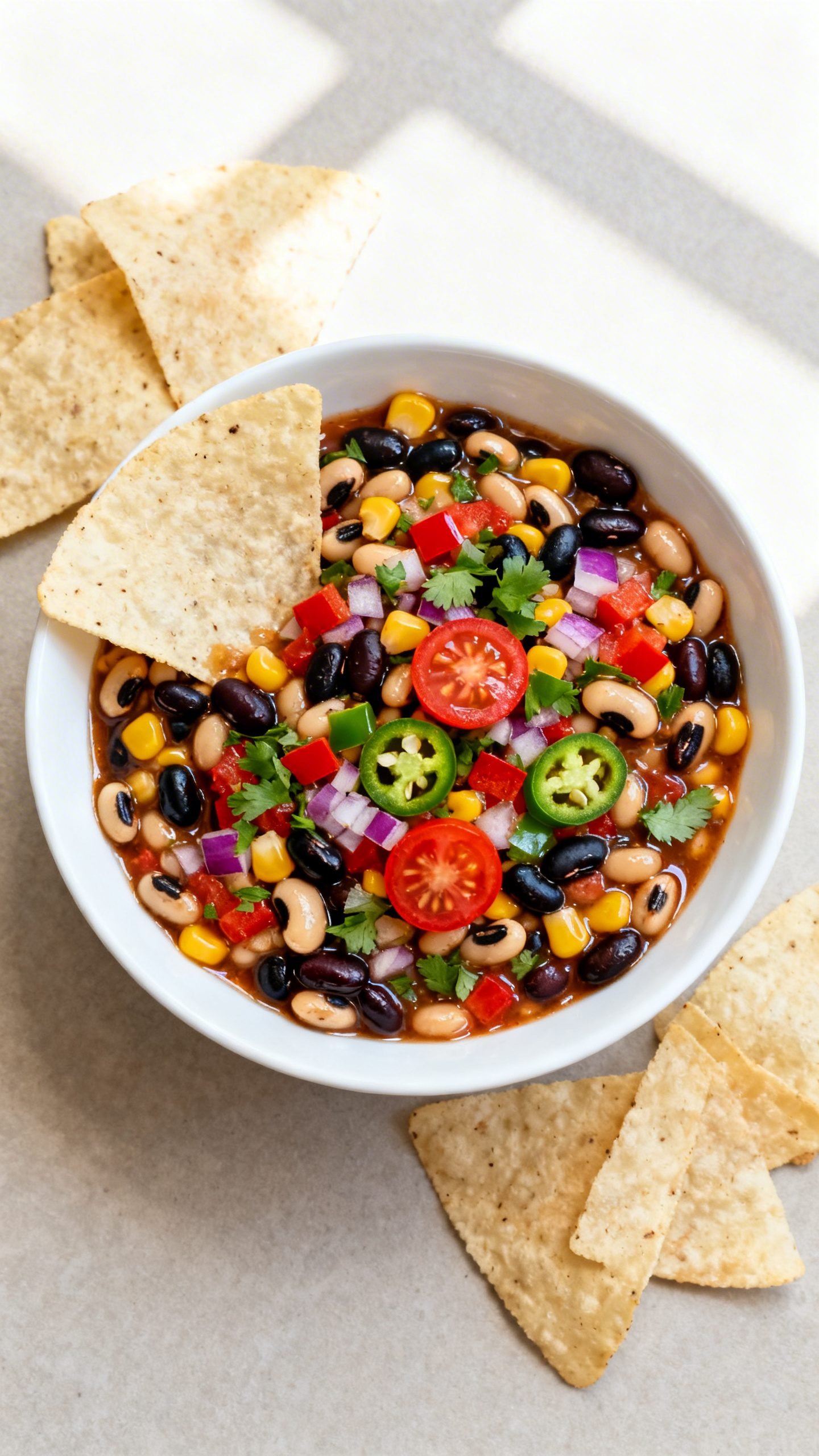 - Toss it together: In a large mixing bowl, add black-eyed peas, black beans, corn, tomatoes, bell peppers, onion, jalapeño, and cilantro. Pour the vinaigrette over the top and gently fold until everything looks glossy and well-coated.
