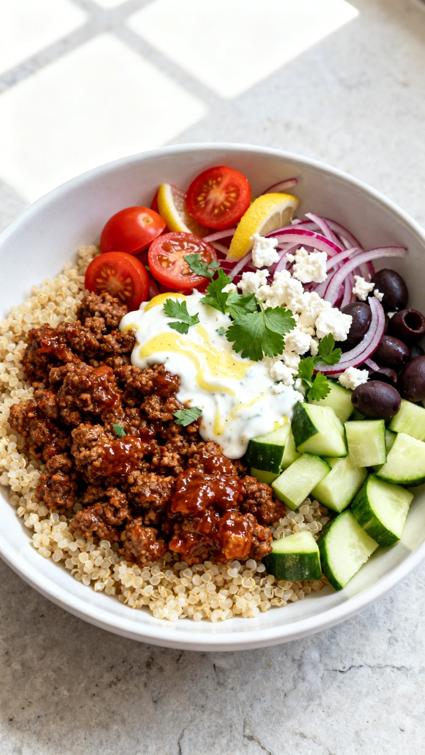 - Assemble bowls with a scoop of warm grains, a portion of spiced beef, cucumber, tomatoes, red onion, olives, and herbs, then spoon on the lemon-garlic yogurt, top with feta, and serve with lemon wedges.