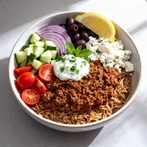 This Healthy Mediterranean Ground Beef Bowl delivers big flavor, balanced nutrition, and weeknight convenience. You get juicy spiced beef, crisp veggies, tangy yogurt sauce, and fluffy grains in one colorful bowl. It hits all the right notes: savory, fresh, creamy, and bright—without a fussy prep list or hard-to-find ingredients.