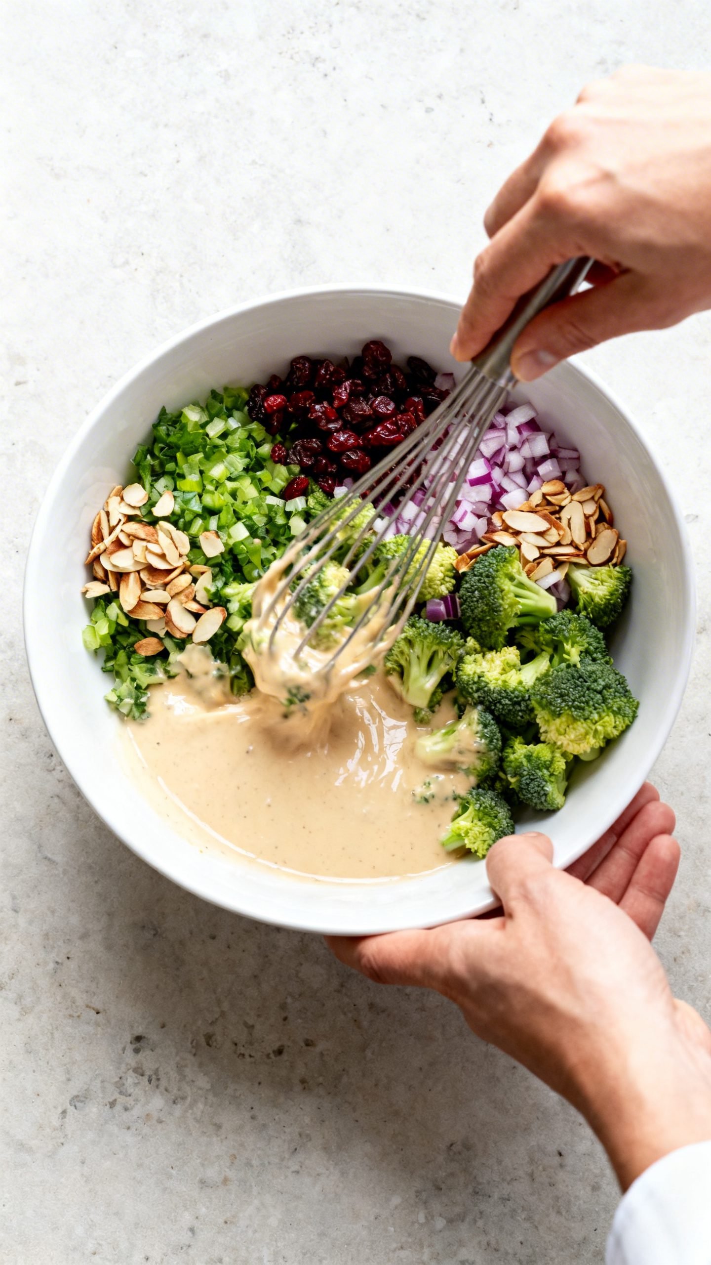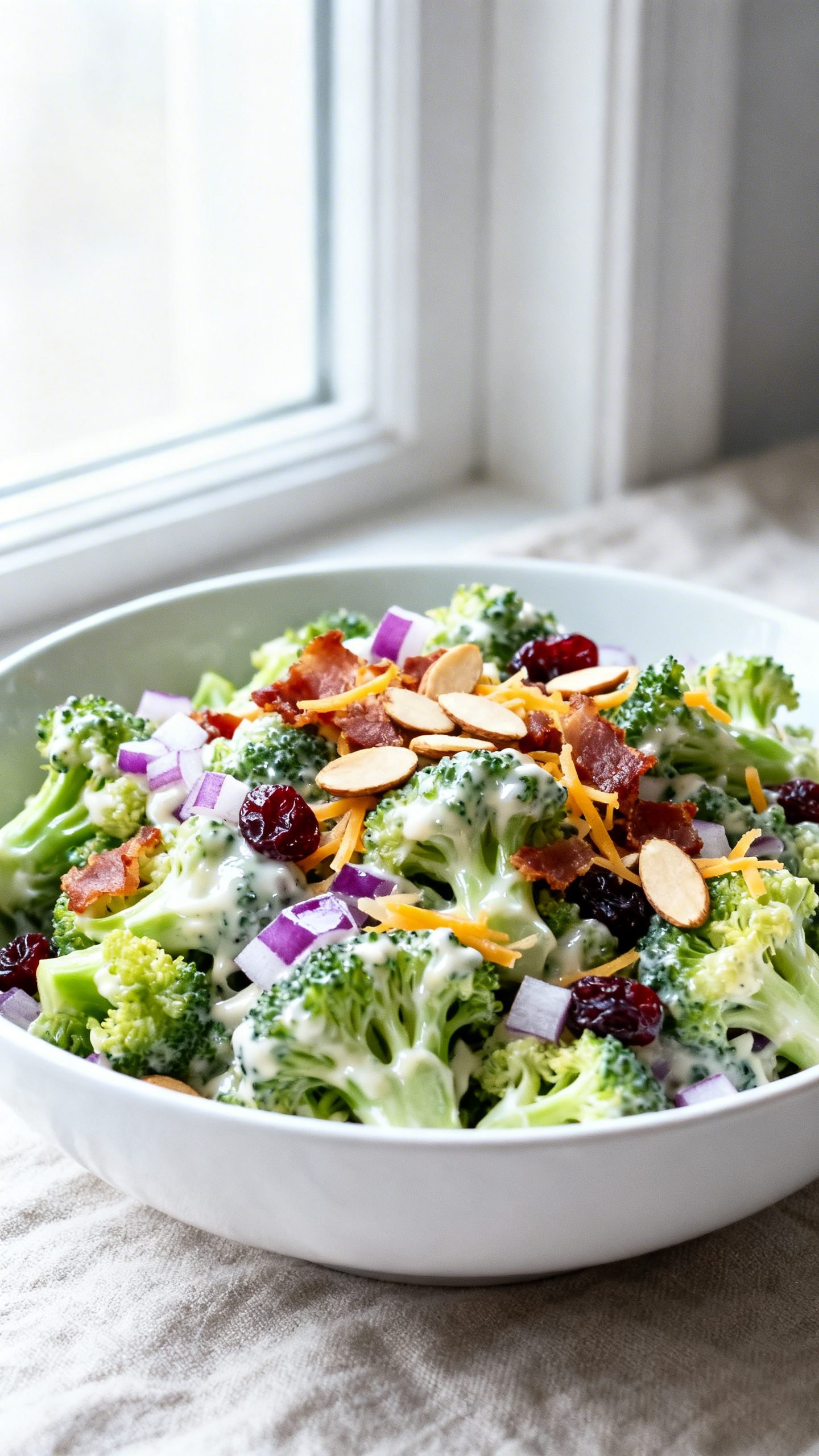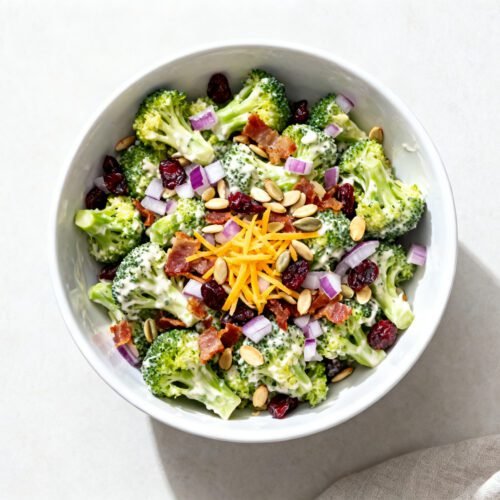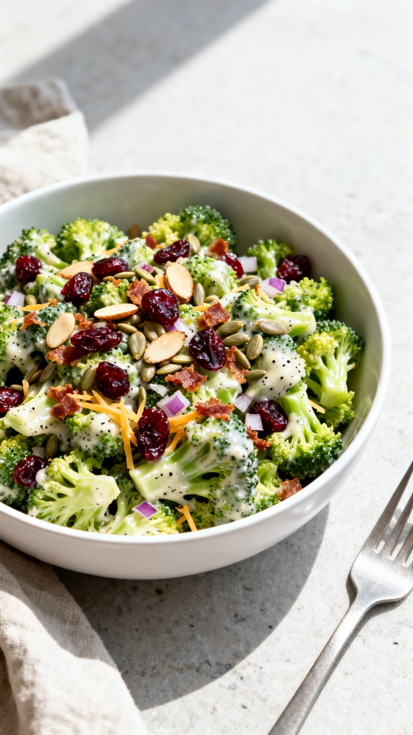 I keep the dressing tangy and light, load the bowl with crisp broccoli, toasted nuts, chewy cranberries, and a little salty bite. Toss it all, chill it briefly, and you’ve got a crowd-pleasing salad that tastes even better the next day.