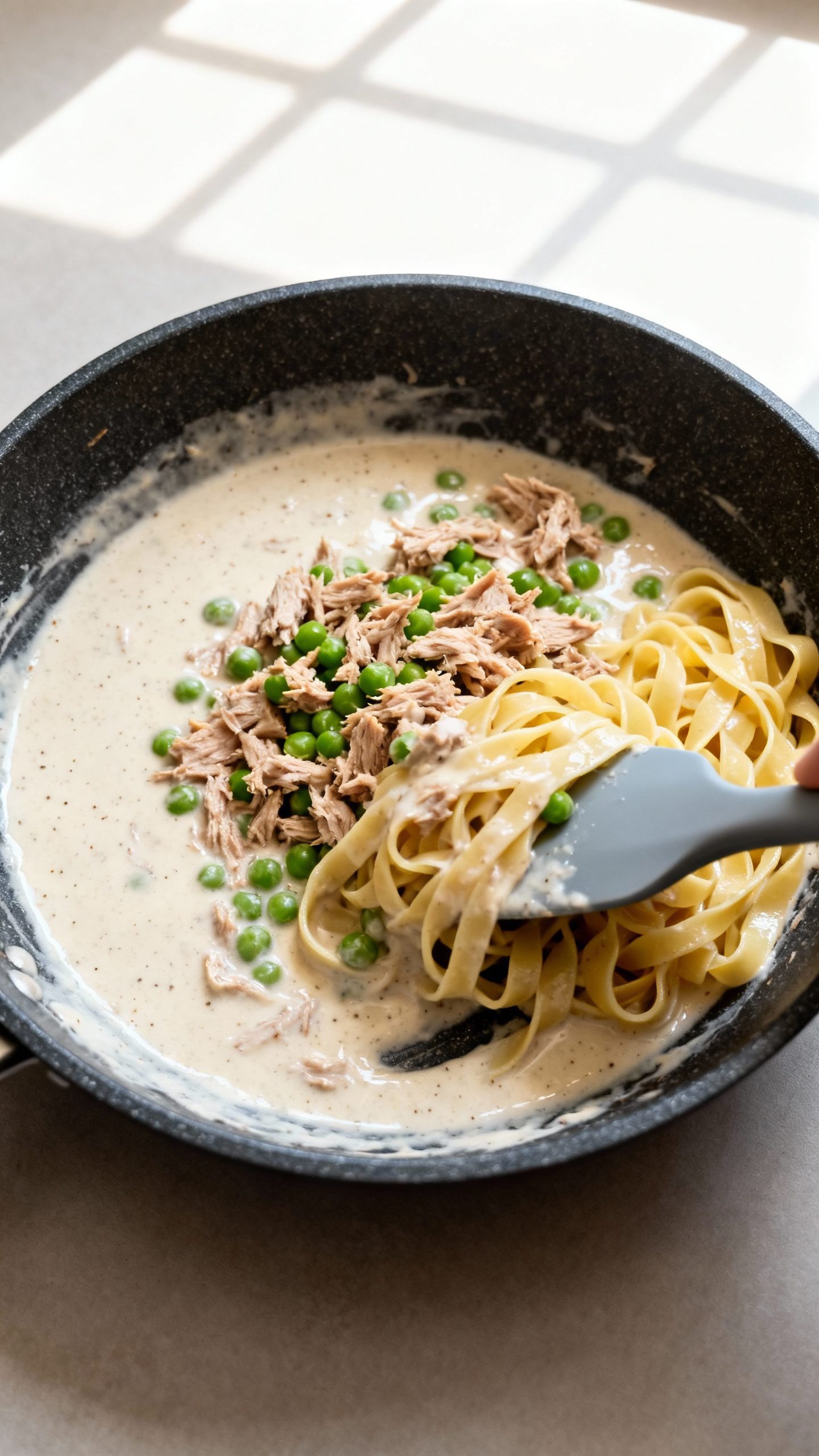 - Add tuna and peas: Gently fold in the drained tuna and frozen peas. Warm through 2 minutes. Avoid aggressive stirring so the tuna stays in nice flakes.