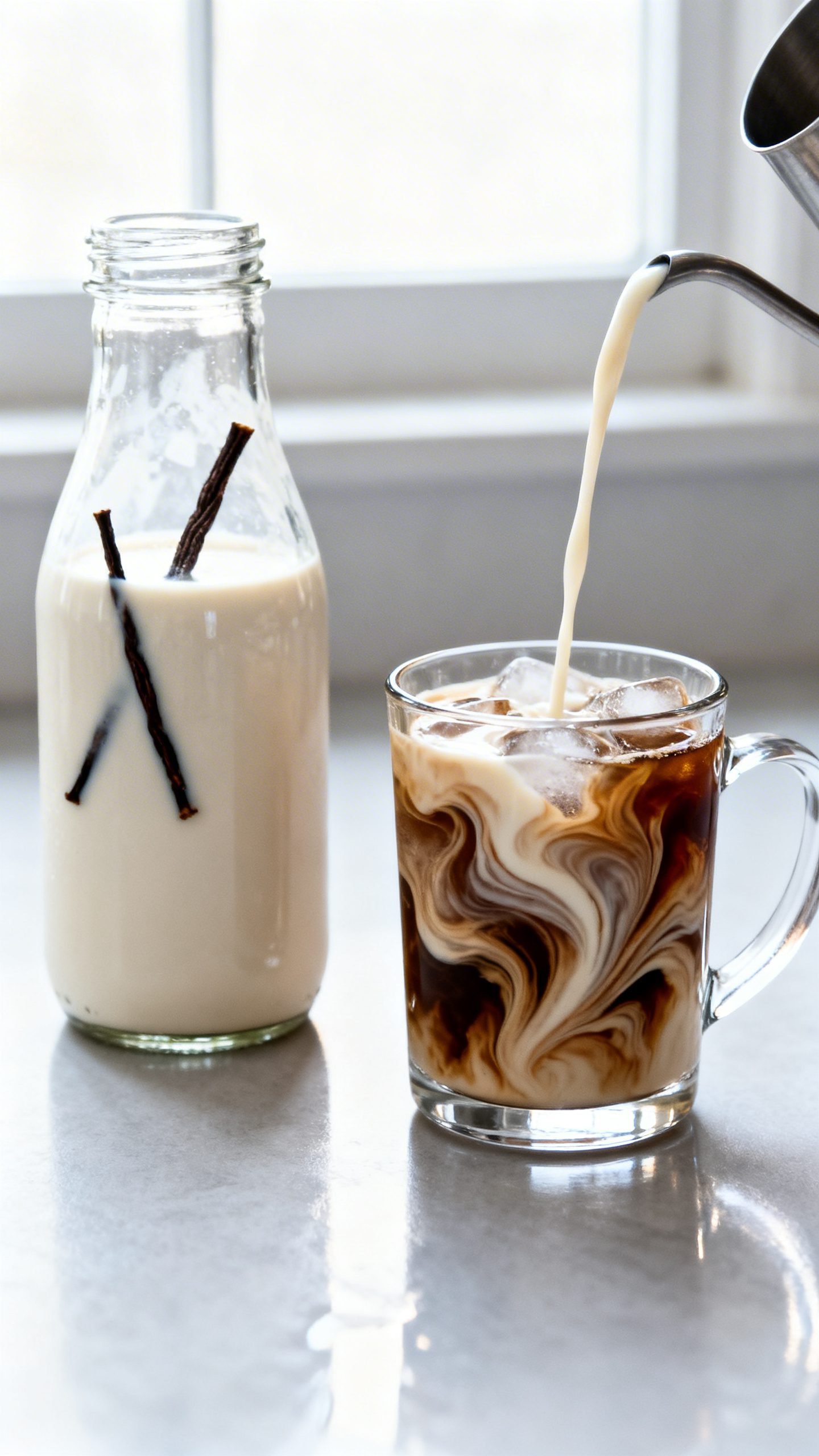 Do not boil; high heat can split dairy and mute vanilla. Measure vanilla carefully to avoid bitterness. For iced coffee, make it slightly sweeter to account for dilution. Refrigerate in a sealed glass container and use within 7–10 days; shake before using. Do not freeze. Variations: add almond extract for French vanilla, use a split vanilla bean, add cinnamon, use maple syrup, stir in caramel, or make sugar-free or dairy-free versions.