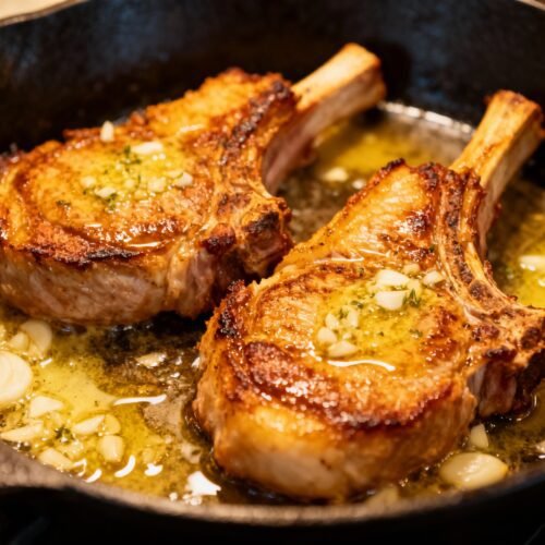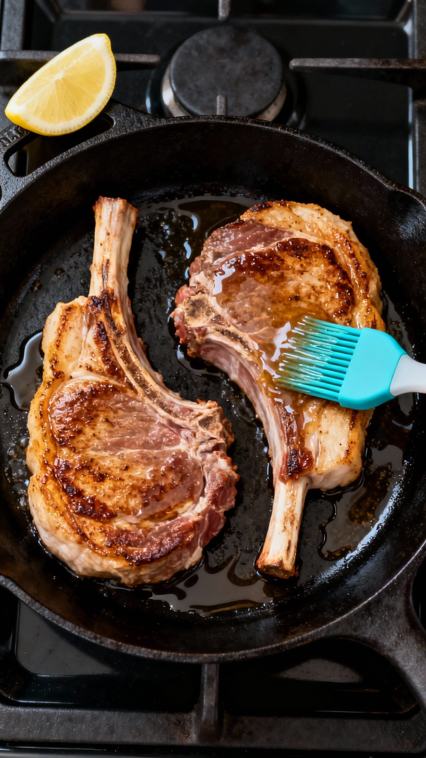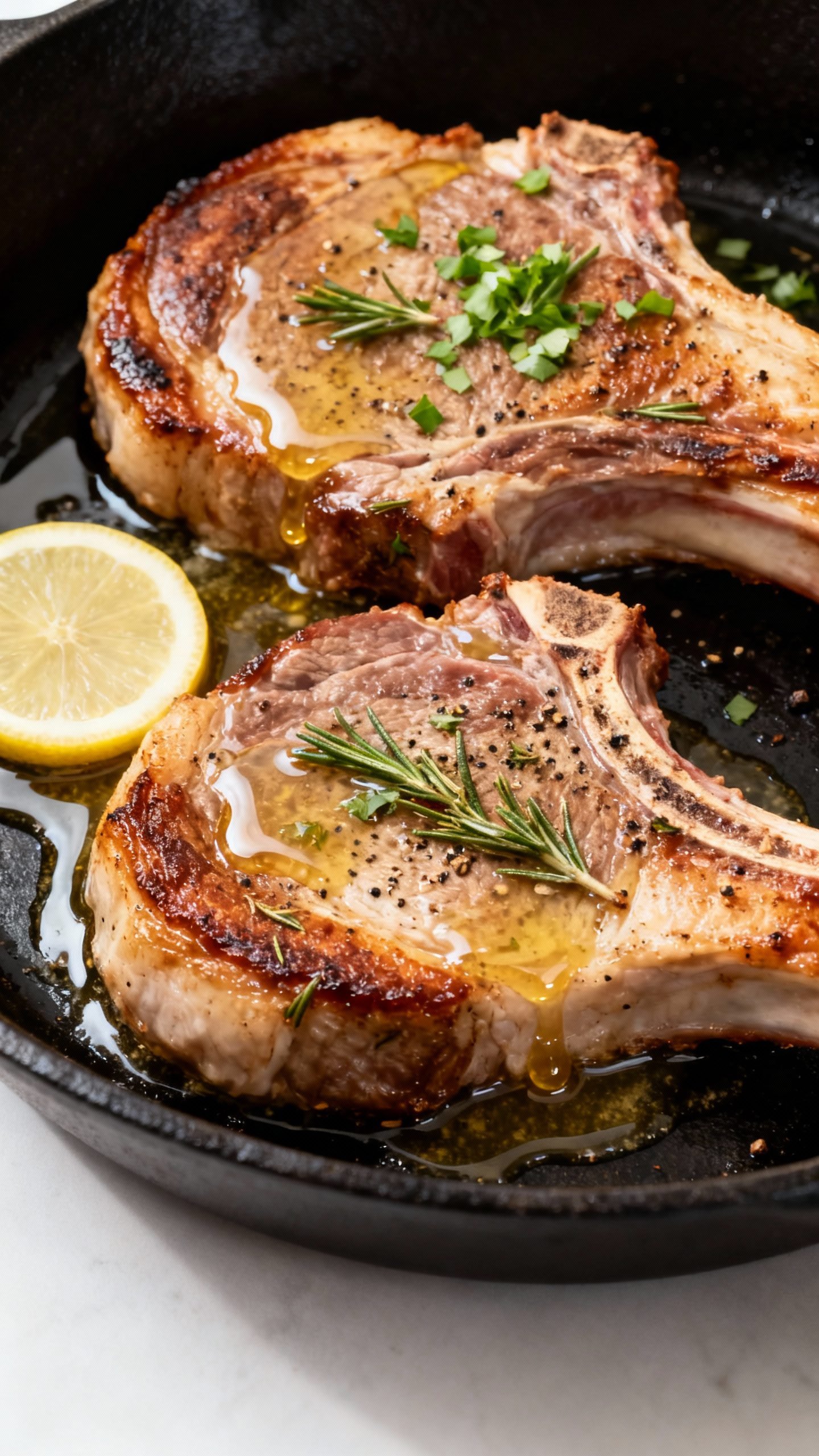 • Garlic butter baste: Butter carries flavor and keeps the chops moist. Garlic, herbs, and lemon brighten everything.