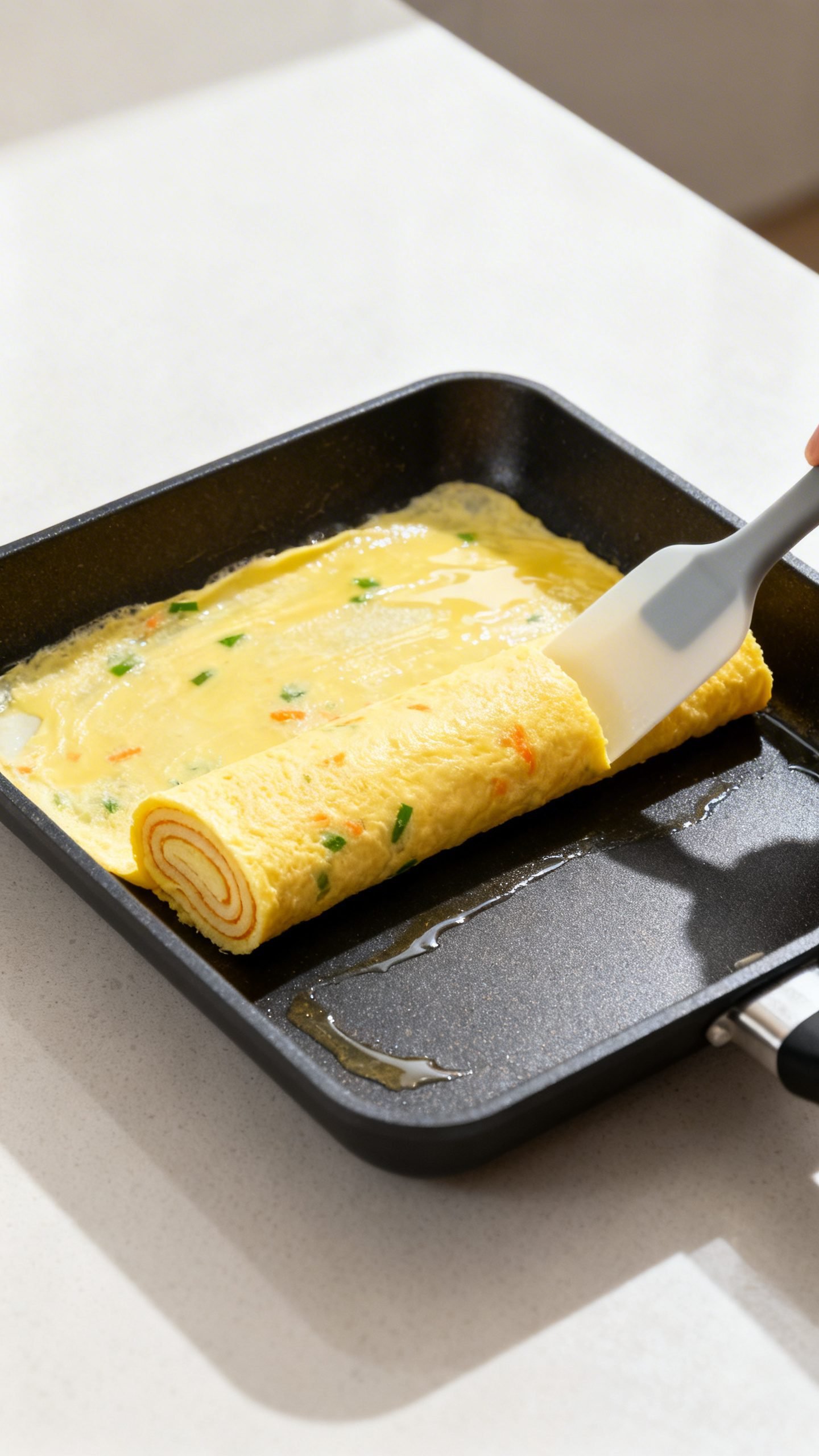 • Lightly oil the empty pan surface, pour another thin layer of egg, lift the roll so egg flows underneath, let it set, then roll the log over the new layer.