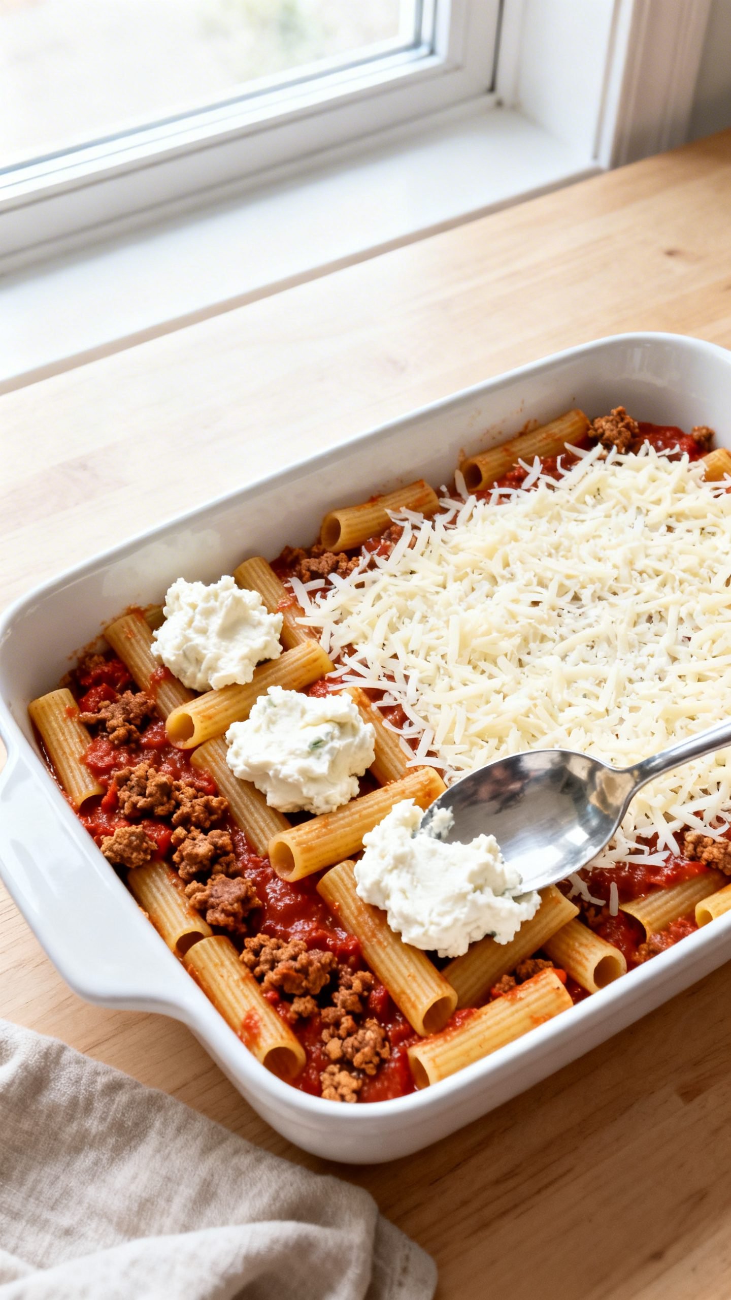 - Combine: In a 9×13-inch baking dish, toss the drained pasta with the meat sauce until evenly coated. Dollop the ricotta mixture all over and gently tuck it in with a spoon so you get pockets of creamy cheese throughout.