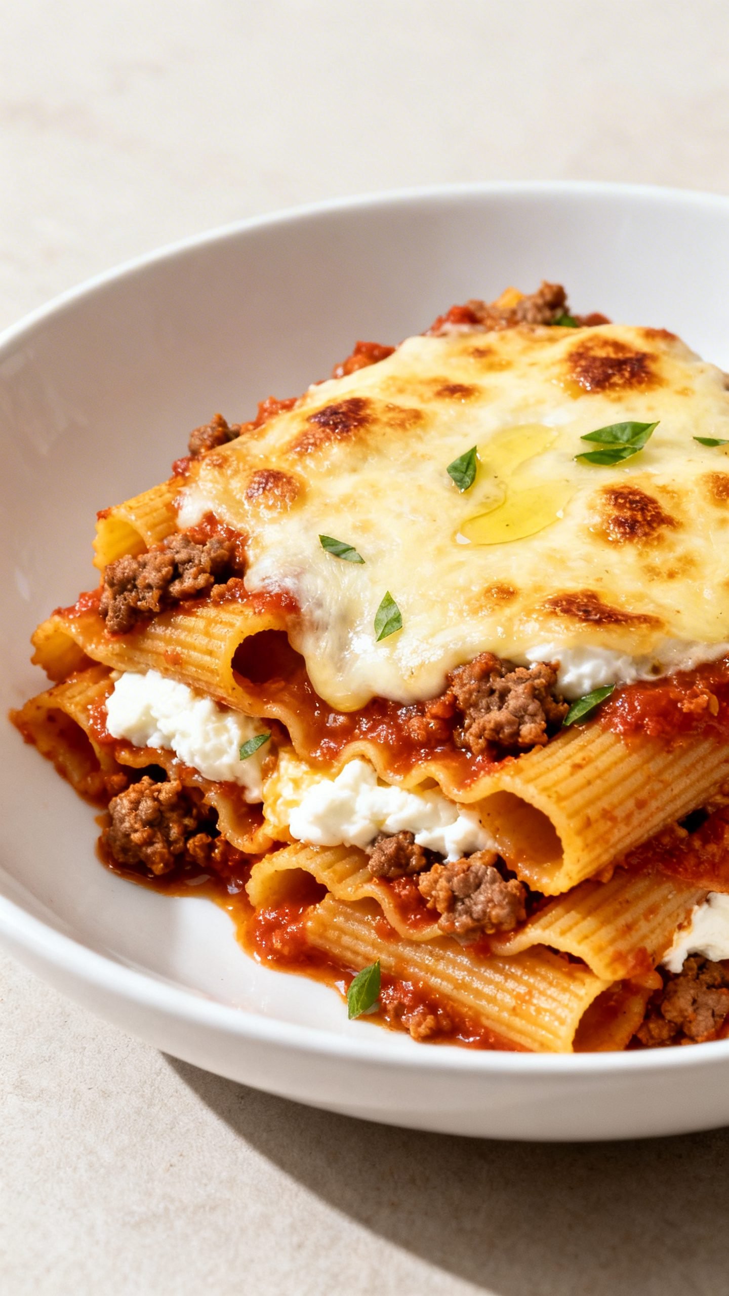 - All the lasagna vibes, none of the fuss: We skip the layering and use a baked pasta method with the same flavors—meaty tomato sauce, creamy ricotta, and melty mozzarella.