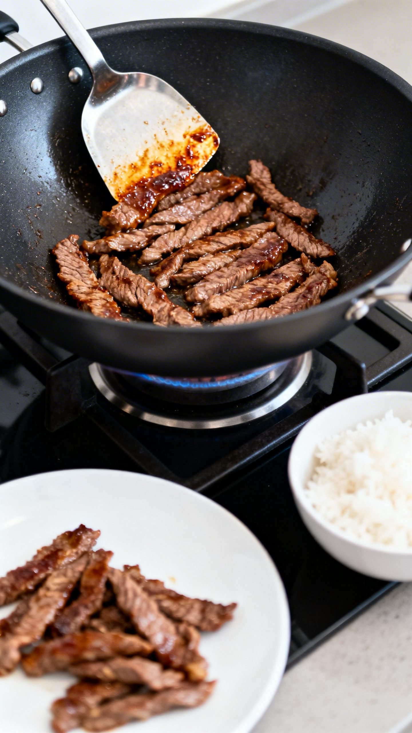 - Shake excess marinade from the beef and sear in batches in a single layer for 60–90 seconds per side until browned and just cooked; transfer to a plate.