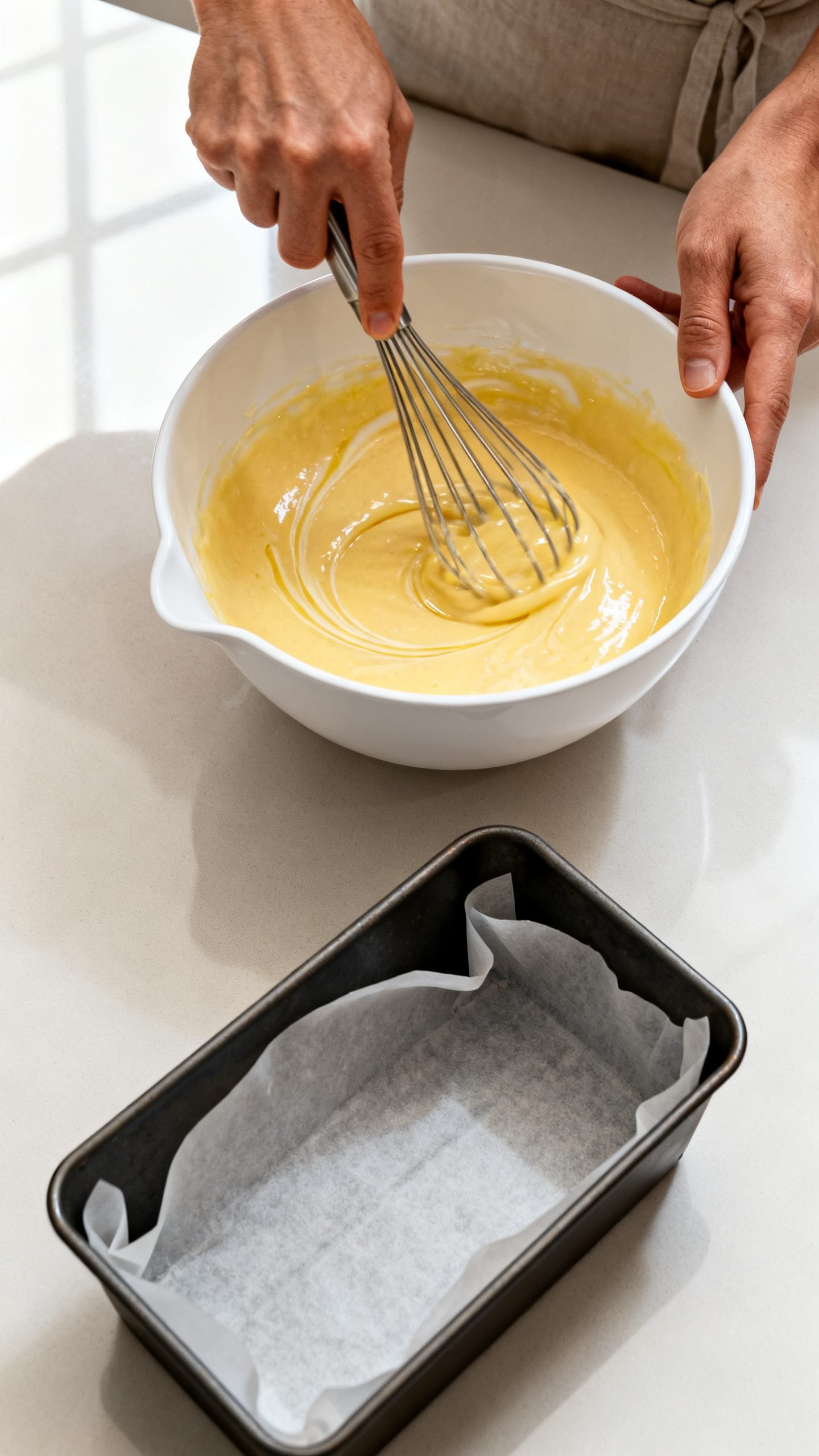 - Prepare the pan: line a 9×5-inch loaf pan with parchment, overhanging the long sides for easy lift; lightly grease.