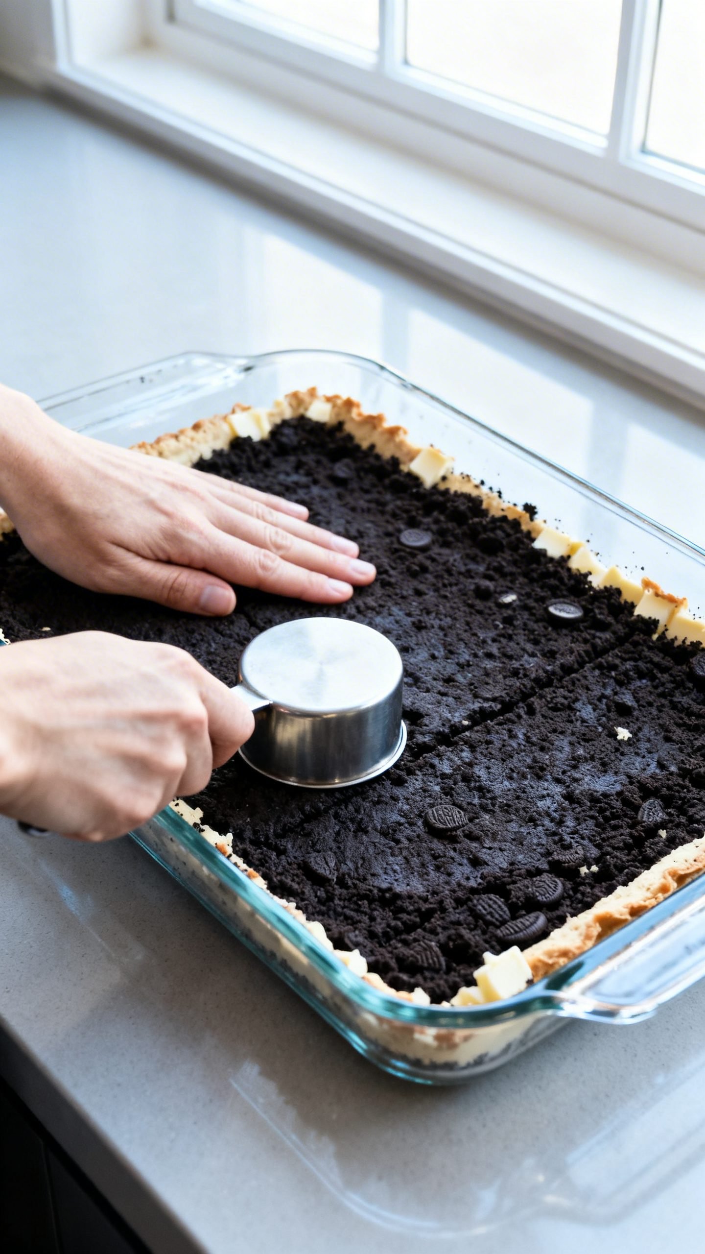 - Press firmly into the bottom of a 9×13 pan. Use the bottom of a measuring cup to compact it well.