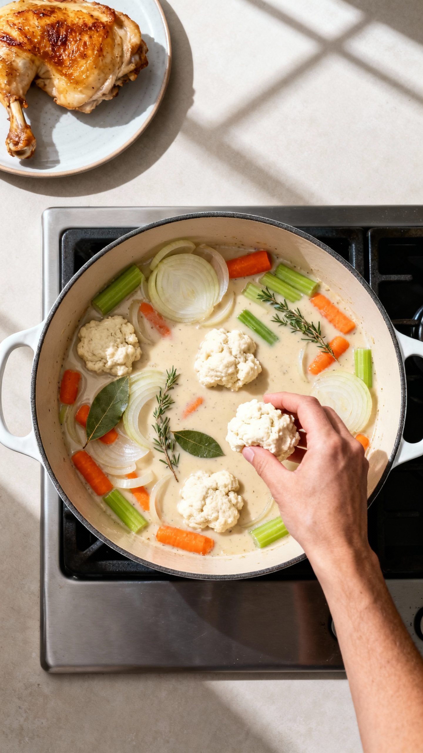 - Rotisserie shortcut: Use rotisserie chicken and store-bought broth; simmer with aromatics to boost flavor, then proceed with thickening and dumplings.