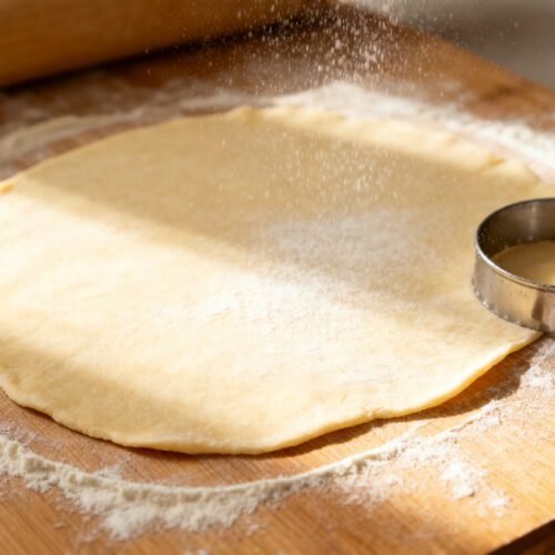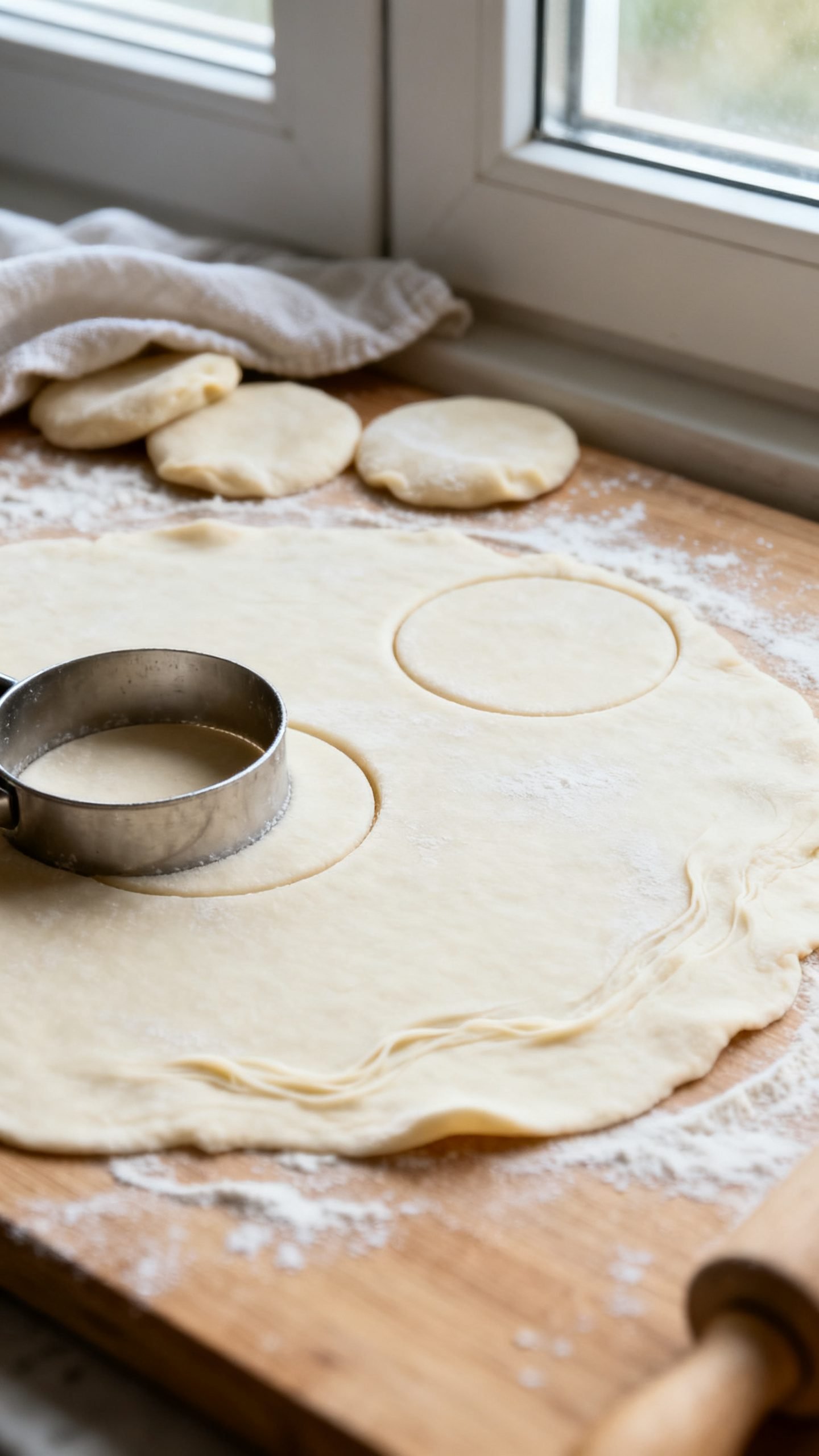 7. Cut rounds: Use a round cutter or glass to cut circles. Gather scraps, cover, and re-roll once. Avoid repeated re-rolling, which can toughen the dough.