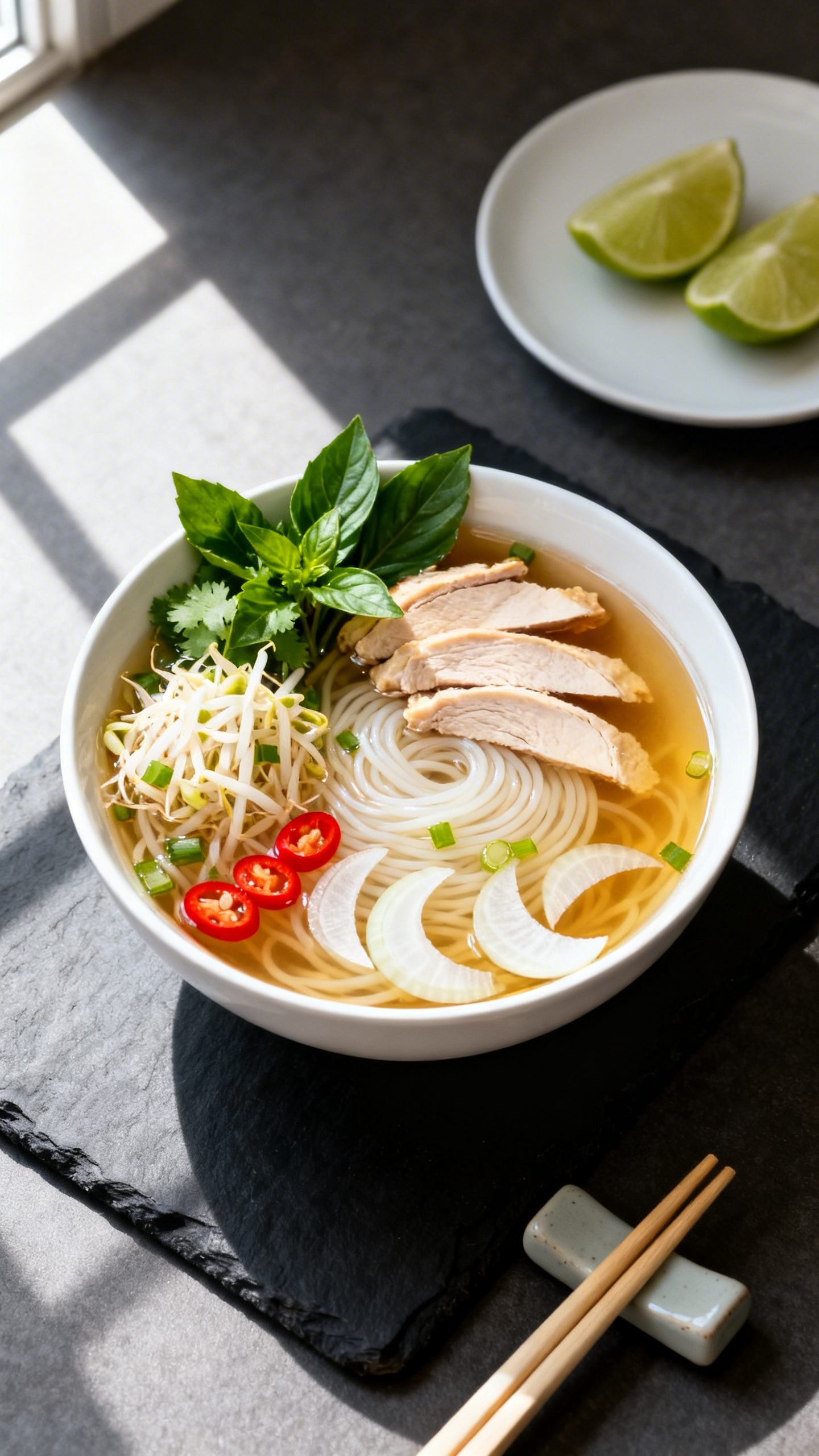 I lean on store-bought chicken stock, thin-sliced chicken, and a smart spice pouch to build that classic pho depth in a fraction of the time. The result: silky rice noodles, bright herbs, a clean-tasting broth, and all the lime and chili you love, ready when you are.