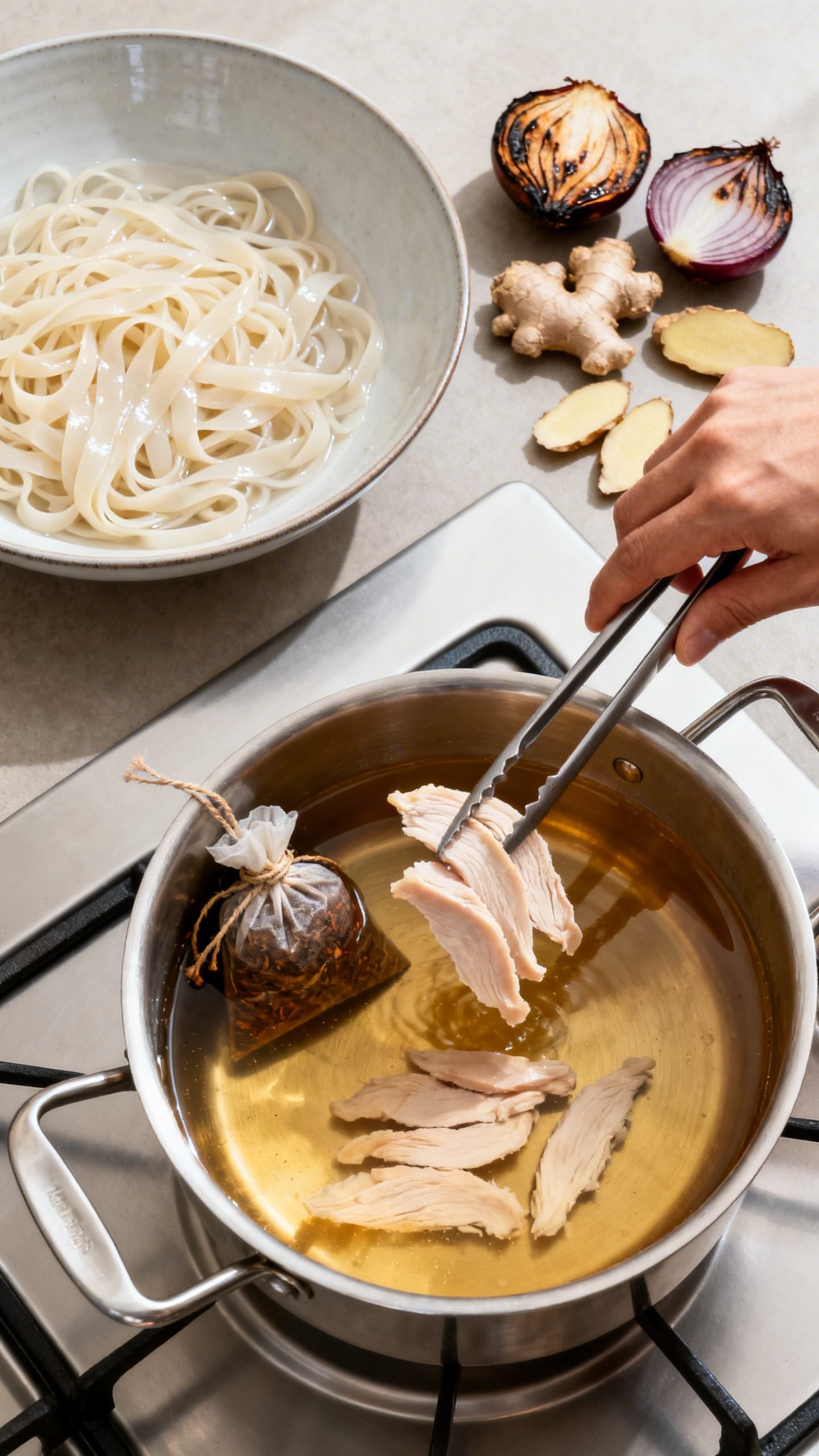 - Remove the spice bundle, onion, and ginger from the pot, bring the broth to a light simmer, add the thin chicken slices in batches, and cook 1–2 minutes until just opaque; transfer cooked chicken to a plate.
