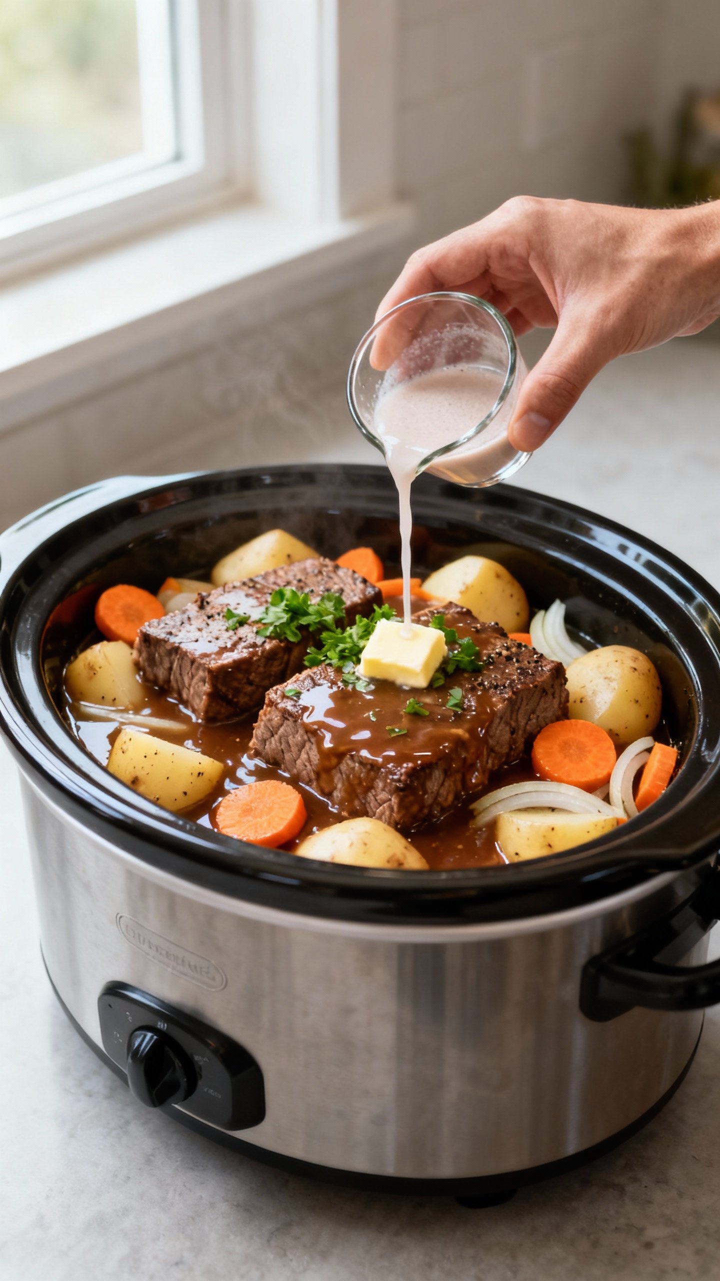 - Stir the slurry into the crock. Add butter if using.