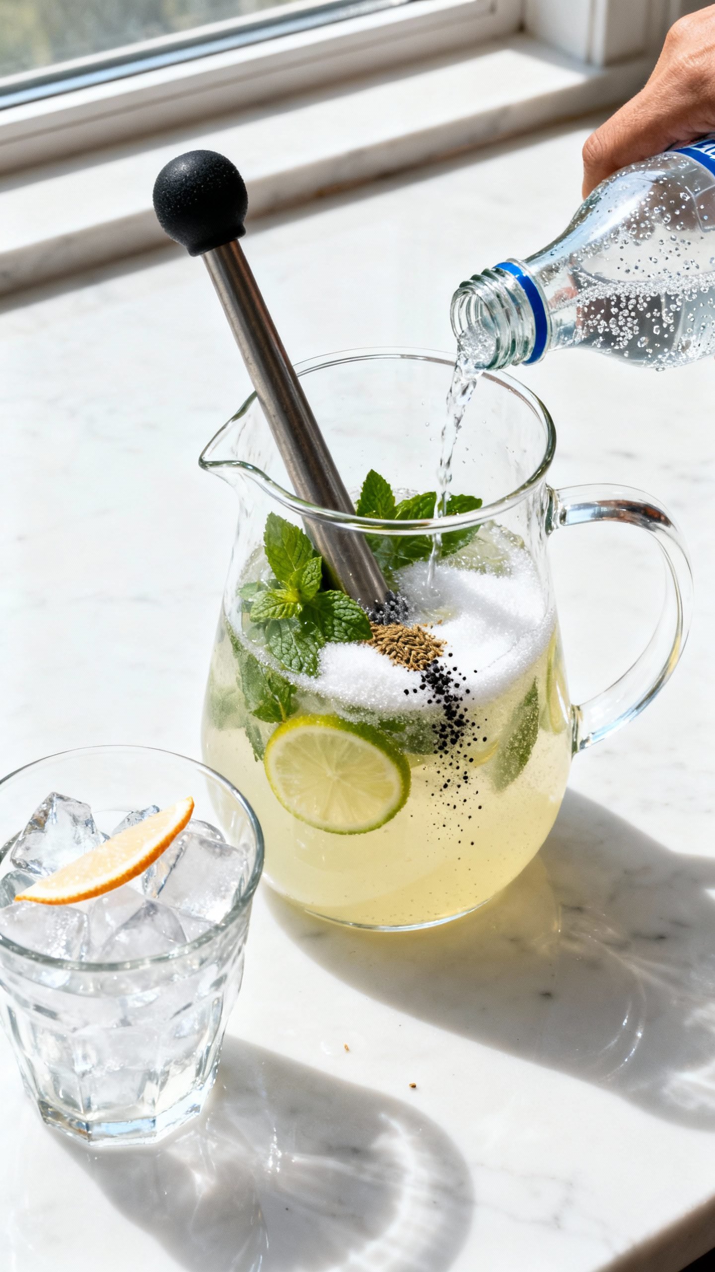 - Muddle the flavor base: In a large pitcher, add mint leaves and sugar (or simple syrup). Lightly muddle for 10–15 seconds until mint smells bright and sugar starts to dissolve. Don’t crush the mint into paste—gentle pressure works best.