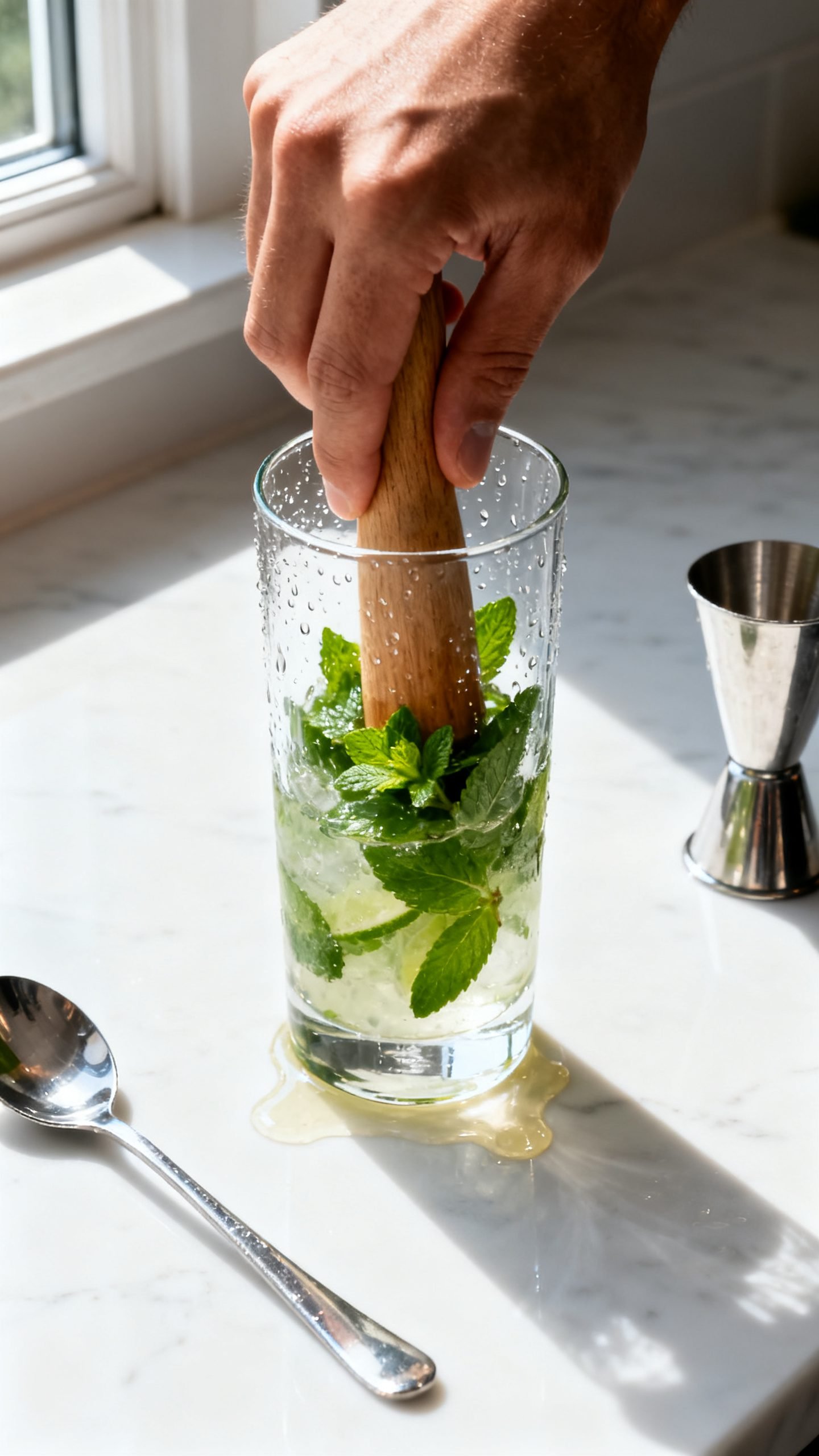 - Gently press the mint with a muddler or the back of a spoon 3–4 times to bruise without shredding.