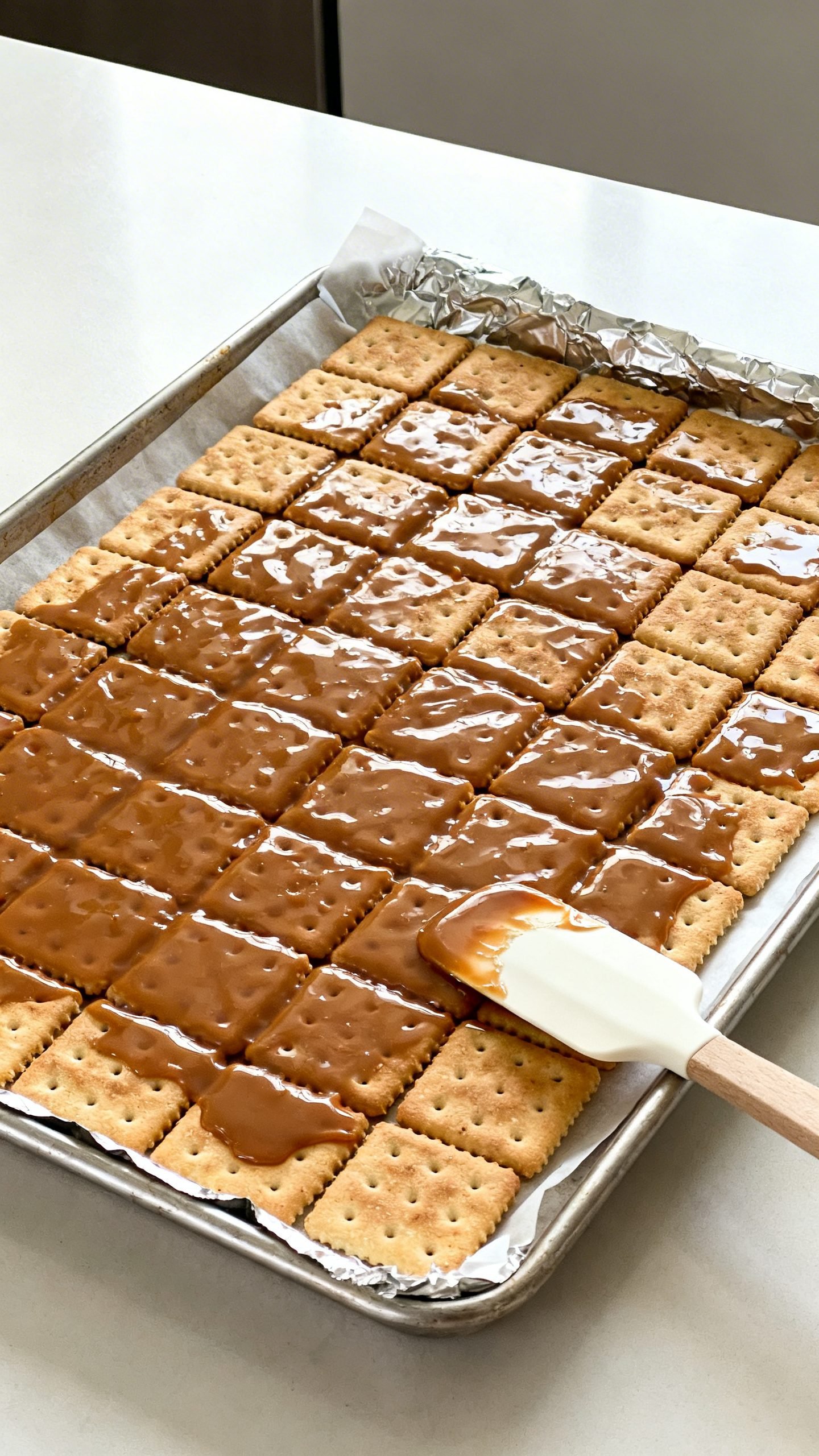 Layer foil under parchment and ensure the toffee covers the crackers. Greasy residue from butter can seep; the double liner keeps cleanup easy.
